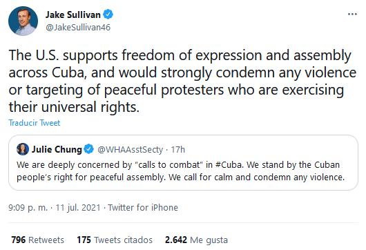 El presidente cubano, Miguel Díaz-Canel, acusó el lunes a Washington de imponer "una política de asfixia económica para provocar estallidos sociales en el país", un día después de las históricas manifestaciones, mientras que el mandatario estadounidense, Joe Biden, le pidió que "escuche a su pueblo".En una transmisión en directo en televisión y radio, el dirigente comunista, rodeado de varios de sus ministros, aseguró que su gobierno trata de "enfrentar y vencer" las dificultades ante las sanciones de Estados Unidos, reforzadas desde el mandato de Donald Trump."¿Qué quieren con estas situaciones?, provocar estallidos sociales, provocar incomprensiones" entre los cubanos, pero también "el famoso cambio de régimen", denunció el presidente.Los impulsores de las protestas "tuvieron la respuesta que merecían y la seguirán teniendo, como en Venezuela", un gran aliado de Cuba, añadió.Biden pidió al "régimen cubano que, en lugar de enriquecerse, escuche a su pueblo y atienda sus necesidades", indicó en un comunicado."Estamos con el pueblo cubano y su claro llamado a la libertad", dijo.El internet móvil, que llegó a Cuba a finales de 2018 y permitió la transmisión en vivo de unas 40 protestas antigubernamentales en toda la isla el domingo, seguía cortado el lunes por la mañana.Miles de cubanos, hartos de la crisis económica, que ha agravado la escasez de alimentos y medicinas y ha obligado al gobierno a cortar la electricidad durante varias horas al día, salieron espontáneamente a la calle el domingo en decenas de ciudades y pueblos de todo el país, al grito de "Tenemos hambre", "Libertad" y "Abajo la dictadura".Una movilización sin precedentes en Cuba, donde las únicas concentraciones autorizadas suelen ser las del Partido Comunista (PCC-único).Si bien Díaz-Canel reconoció el descontento de algunos cubanos, dio a los revolucionarios "la orden de combate", para que "salgan a las calles donde quiera que se vayan a producir estas provocaciones".Ante esto, e l domingo por la noche, el gobierno de Estados Unidos había advertido a las autoridades cubanas contra el uso de la violencia contra "manifestantes pacíficos"."Estados Unidos apoya la libertad de expresión y reunión en Cuba y condenaría fuertemente cualquier uso de la violencia contra manifestantes pacíficos que están ejerciendo sus derechos universales", señaló en Twitter el asesor de Seguridad Nacional del gobierno estadounidense, Jake Sullivan."El Asesor de Seguridad Nacional de la Casa Blanca carece de autoridad política y moral para hablar sobre #Cuba", reaccionó el lunes en Twitter el canciller cubano, Bruno Rodríguez."Su gobierno ha destinado cientos de millones de dólares para la subversión en nuestro país e impone un bloqueo genocida, principal responsable de carencias económicas", añadió.Tras una breve reconciliación entre 2014 y 2016, las relaciones diplomáticas entre Cuba y Estados Unidos están en su nivel más bajo desde que Donald Trump endureció el embargo en vigor desde 1962, denunciando violaciones de derechos humanos y apoyo de La Habana al gobierno de Nicolás Maduro en Venezuela.Estas sanciones, así como la ausencia de turistas debido a la pandemia, han sumido a Cuba en una profunda crisis económica y han generado un fuerte malestar social, seguido de cerca en Washington y el continente americano.GC