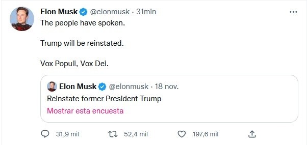 El nuevo propietario de Twitter, Elon Musk, ha anunciado que restablece la cuenta en la red social del expresidente de EU, Donald Trump, tras promover una encuesta que ha resultado favorable a esta decisión."El pueblo ha hablado. Trump será reintegrado. Vox Populi, Vox Dei", ha anunciado Musk a través de su cuenta oficial.Musk promovió una encuesta de 24 horas que terminó este sábado para preguntar si debía volver a la red social el expresidente de EU, Donald Trump, a quien la plataforma suspendió indefinidamente después de vincular sus comentarios con el asalto al Capitolio.Según los resultados que ha publicado Musk de la encuesta, que ha recibido 15 millones 085 mil 458 votos, el 51.8 % se ha mostrado a favor del restablecimiento de la cuenta a Trump, mientras que el 48.2 % lo ha hecho en contra.A principio de noviembre, Musk dijo que Twitter "no permitirá" que ninguna persona que haya sido eliminada de la red social por violar sus reglas regrese a la plataforma hasta que la compañía tenga un proceso claro.JM
