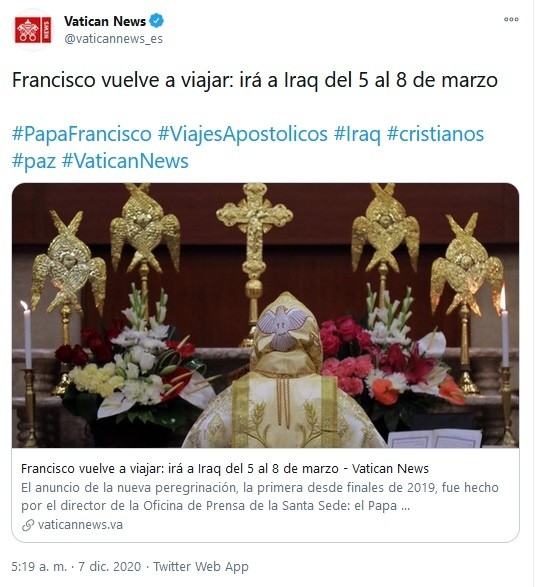 El Papa Francisco visitará Iraq del 5 al 8 de marzo próximos, su primer viaje internacional desde el inicio de la pandemia del coronavirus, y una visita histórica a uno de los países que más han sufrido por las guerras y el coronavirus."Aceptando la invitación de la República de Iraq y de la Iglesia católica local, el Papa Francisco realizará un viaje apostólico a ese país del 5 al 8 de marzo de 2021, durante el cual visitará Bagdad", además de la región de Ur, donde según la tradición nació Abraham, la ciudad de Erbil, así Mosul y Qaraqosh, en la llanura del Nínive, en el norte, informó este lunes el vocero del Vaticano, Matteo Bruni.La llanura del Nínive había sido ocupada por los yihadistas del grupo Estado islámico (EI) entre 2014 y 2017.Se trata de una visita histórica, que "simboliza un gesto de cercanía hacia toda la población de ese martirizado país", reconoce el portal de noticias del Vaticano, Vatican News.El gobierno de Iraq, que declaró la victoria sobre el grupo EI hace tres años, decretó en marzo un confinamiento en un intento de contener la pandemia, lo que generó graves consecuencias económicas para un país golpeado ya duramente por la crisisFrancisco, que quería que su primer viaje al extranjero fuera a uno de los lugares más afectados por el coronavirus, eligió Iraq "por su fuerte simbolismo religioso y como un apoyo explícito al regreso de las comunidades cristianas, que huyeron ante el acoso del grupo Estado Islámico", explicó por su parte la página Religión Digital.Según el portal del Vaticano, en Iraq antes de 2003 --año del inicio de una intervención militar liderada por Estados Unidos que condujo a la caída de Sadam Husein-, los cristianos sumaban alrededor de 1 a 1.4 millones de personas."El horror de la guerra y la ocupación de la llanura de Nínive por el EI, entre 2014 y 2017, los redujo a entre 300 mil y 400 mil", subraya esta fuente.El viaje incluye por ello esa etapa muy importante en Nínive, epicentro de la persecución de los cristianos iraquíes.Sin embargo el Vaticano precisó este lunes que "el programa del viaje será publicado ulteriormente teniendo en cuenta la evolución de la crisis sanitaria mundial"Francisco había expresado claramente su intención de visitar Iraq en junio de 2019, durante una audiencia con los participantes en una conferencia sobre las iglesias orientales.La elección de Erbil, capital del Kurdistán, también quiere ser un apoyo a los kurdos, "atrapados en una guerra sin fin, y al acoso de Turquía", subraya el experto de Religión Digital.El viaje del papa representa "un mensaje de paz para Iraq y toda la región", reaccionó por su parte este lunes el ministerio de Relaciones Exteriores iraquí.GC