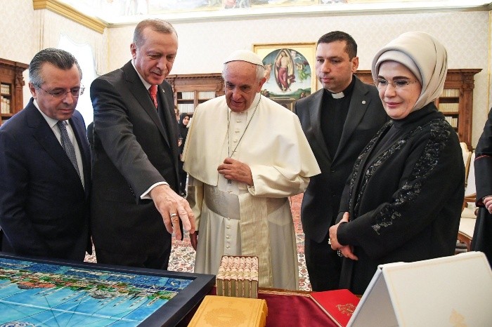 El Papa Francisco se reunió hoy en el Vaticano con el presidente turco Recep Tayyip Erdogan durante cincuenta minutos, en una audiencia más larga de lo habitual, y le obsequió con varios regalos que aluden a la paz.El mandatario turco llegó al Vaticano con un retraso de cinco minutos, a las 9:35 locales (8:35 GMT) y junto a una delegación compuesta por 16 personas, entre ellas su esposa, Emine Erdogan, y se le pudo ver visiblemente sonriente.Fue recibido en la "Sala del Tronetto" del Palacio apostólico por el Pontífice, que le dio los buenos días, mientras que Erdogan le preguntó en inglés cómo se encontraba.El encuentro a puerta cerrada y con traductores en la biblioteca de Francisco comenzó a las 9:54 locales (8:54 GMT) y se extendió hasta las 10:45 (9:45 GMT).Tras la reunión se procedió al tradicional intercambio de regalos: Erdogan le ofreció un cuadro con una panorámica de la ciudad de Estambul, sobre el que le mostró algunos de los edificios más emblemáticos, como la Mezquita Azul o Santa Sofía.También un baúl con cuatro libros, entre los que se encontraba "Mesnevi", del místico persa del siglo XIII Yalal ad-Din Muhammad Rumi, y otros tres con su historia y su biografía.Por su parte el Papa ofreció a Erdogan un medallón que, afirmó, representa "un ángel de la paz que aplasta al demonio de la guerra" y que es "símbolo de un mundo basado en paz y justicia".También le regaló un grabado en aguafuerte con la basílica de San Pedro del Vaticano con los dos campanarios frontales construidos y, como es habitual, sus documentos pontificios, entre ellos la encíclica "Laudato Si" (2015) sobre ecología y el mensaje para la Jornada Mundial de la Paz de este año.La llegada de Erdogan al Vaticano, la primera de un presidente turco en los últimos 59 años, estuvo protegida por un potente dispositivo de seguridad, con las inmediaciones cortadas al tráfico y con controles policiales para acceder a pie al área de San Pedro.El mandatario viajó a la Santa Sede para abordar con el Papa la situación de Jerusalén y la necesidad de preservar su "estatus quo" después de que el presidente estadounidense, Donald Trump, la reconociera como capital de Israel, según explicó en una entrevista publicada el domingo por "La Stampa".No obstante el Vaticano aún no ha dado detalle alguno sobre las conversaciones y se espera que emita un comunicado próximamente.