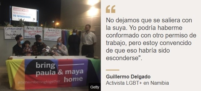 "Como pareja homosexual, es incluso ofensivo que te pregunten quién es el verdadero padre del hijo".Guillermo nunca se sintió discriminado por ser homosexual en Namibia, hasta el momento en que decidió oficializar su relación con su esposo, Phillip Lühl, en 2017.En los últimos meses, su caso ha tomado prominencia, especialmente tras el nacimiento de sus hijas, Paula y Maya, en marzo de este año.Namibia se niega a reconocer tanto el matrimonio como la paternidad de la pareja, lo que dejó a sus tres hijas apátridas hasta el 20 de mayo, cuando finalmente México les otorgó la ciudadanía.Las relaciones sexuales entre hombres están prohibidas en Namibia, pero esta ley no suele aplicarse.Nacido y criado en Ciudad de México, Guillermo Delgado asegura, en entrevista con BBC Mundo, que jamás pensó que acabaría viviendo en el sur de África.Pero a sus veintitantos conoció a su esposo Phillip, un namibio de ascendencia alemana, cuando ambos estudiaban una maestría en arquitectura en los Países Bajos."Fue en 2008 y empezamos a salir poco después de conocernos. Recuerdo que al finalizar la escuela comenzamos a trabajar y luego Phillip se enteró de que en su país se estaba formando la primera escuela de arquitectura", relata Guillermo, quien ahora tiene 36."Un día me preguntó: '¿Por qué no nos vamos a Namibia?', y yo le dije que sí".Él pensó que la mudanza sería por un par de años, pero más de una década después sigue viviendo en Windhoek, la capital del país.Desde su llegada a África, Guillermo cuenta que nunca estuvo "en el closet"."Siempre hemos sido abiertos respecto a nuestra sexualidad con todos nuestros familiares, amigos y colegas, desde el primer día. Como gay, francamente siempre me sentí bien en Namibia", prosigue.Asegura que la sociedad actúa en base a una política similar a la de "Don't ask, don't tell" (No preguntes, no digas), una ley que les prohibía a los miembros homosexuales y bisexuales de la armada estadounidense revelar su orientación sexual y que fue abolida en 2011."Somos dos hombres, que igual podrían pasar como amigos, así que la gente que no quería ver lo que somos, simplemente se hacía la vista gorda. Por ese lado siempre fue relativamente fácil para nosotros", explica.Pero en 2017 la pareja comenzó a sufrir de primera mano los problemas que puede ocasionar el ser homosexual en Namibia. Precisamente cuando quisieron ser reconocidos como una pareja del mismo sexo ante las autoridades de inmigración."Comenzamos a tener problemas cuando quisimos oficializar lo que somos".Si bien el arquitecto mexicano afirma que antes de eso eran felices en Windhoek, no oculta que en algún momento pensaron que podrían tener una mejor vida en la vecina Sudáfrica.En 2014 decidieron dar el paso y se mudaron a Ciudad del Cabo, la capital legislativa de Sudáfrica.Poco después se casaron en lo que es el único país africano que reconoce el matrimonio entre personas del mismo sexo e inmediatamente comenzaron el "tortuoso" proceso para tener hijos mediante gestación subrogada.Sudáfrica es uno de los países más liberales del mundo en cuanto a derechos para la comunidad LGBTQ.En 2006 se convirtió en una de las primeras naciones en aprobar el matrimonio entre dos personas del mismo sexo y desde 2003 permite la subrogación comercial para parejas homosexuales."Es un proceso largo y no es fácil. Desde el punto en el que decidimos tener hijos hasta el nacimiento Yona (la primera hija de la pareja) pasaron cinco años".Guillermo estaba estudiando un doctorado en Arquitectura y Planificación en la Universidad de Ciudad del Cabo y tan pronto lo terminó, la pareja sintió que Namibia era el lugar a donde realmente pertenecían y decidieron regresar.Yona nació en Sudáfrica en 2019 y pudo viajar a Windhoek gracias a un documento de viaje temporal que le otorgaron las autoridades namibias.Los acontecimientos posteriores hacen que Guillermo sospeche que cuando les dieron aquel papel no se dieron cuenta de que eran una pareja del mismo sexo."Cuando llegamos a Windhoek, aplicamos por la ciudadanía namibia de Yona, pero allí notaron que éramos dos hombres y comenzaron a causarnos problemas", explica.Los agentes de inmigración le preguntaron: "¿Quién es el verdadero papá?. No es posible que sean dos papás".Guillermo recuerda que fueron momentos bastante incómodos."Yo diría que, como pareja homosexual, es incluso ofensivo que te pregunten quién es el verdadero padre del hijo"."Para nosotros no hay un verdadero padre ni un padre de mentira", agrega.Posteriormente les pidieron una prueba de ADN para "confirmar que el ciudadano namibio estaba efectivamente vinculado" con la niña.Desde ese momento, Guillermo y Phillip luchan por la ciudadanía namibia de Yona, pero no han tenido mucho éxito. Se espera que una corte namibia emita su veredicto sobre el caso el próximo 4 de agosto.El mexicano describe su experiencia con la paternidad subrogada como una "odisea"."Fue bonito, pero difícil. Estamos inmensamente agradecidos con la madre subrogada, pero no se nos ocurriría jamás volverlo a hacer porque se nos hizo un proceso bastante pesado", detalla.Sin embargo, dos semanas después del nacimiento de Yona, la mujer que recién había dado a luz se ofreció a tener otro hijo para la pareja y ninguno de los dos se lo pensó dos veces."Siempre quisimos dos niños o niñas, pero no queríamos empezar el proceso con otra madre subrogada porque es muy largo y uno se conecta e invierte mucho sentimentalmente y en varias otras formas".En ese mismo instante comenzaron el proceso legal y el papeleo necesario para poder iniciar la gestación.El 13 de marzo de 2021, dos años después, nacieron Paula and Maya, trayéndole más felicidad a la familia.Pero, según relata Guillermo, el nacimiento de las gemelas también complicó las cosas desde un punto de vista legal."Todavía no se sabía si el Estado namibio o el mexicano le iban a dar la ciudadanía a Yona. La