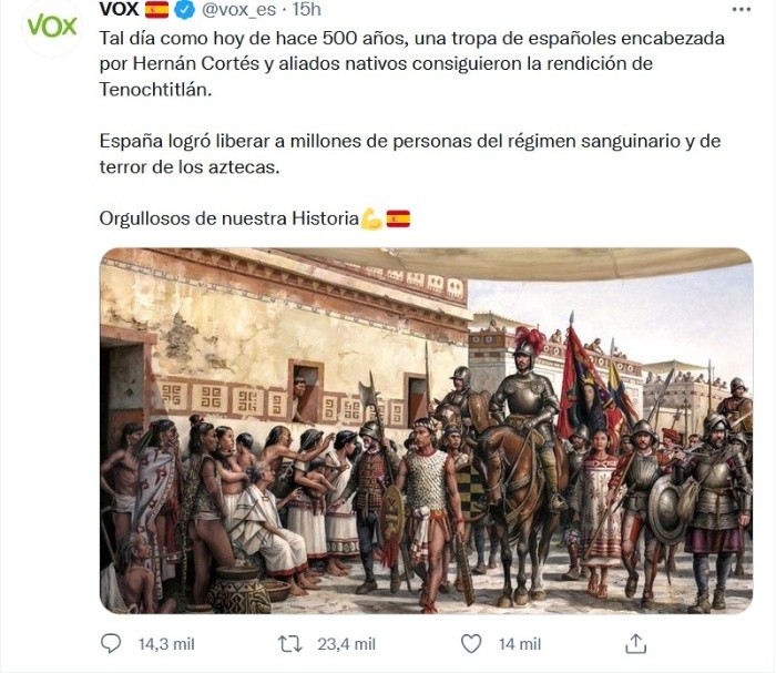 Vox, partido español de ultraderecha, celebró a través de su cuenta de Twitter la rendición de Tenochtitlán, esto debido a la conmemoración de los 500 años de la resistencia indígena en México, ya que el 13 de agosto del año 1521 un grupo de conquistadores liderado por Hernán Cortés junto a miles de indígenas derrotaron a la poderosa capital del imperio mexica o azteca.Agregaron que España logró liberar a millones de personas del régimen sanguinario y de terror de los aztecas, además de mencionar que se encuentran orgullosos de su historia.Por su parte, comunidades indígenas y zapatistas ubicadas en España organizaron el primer encuentro “No Nos Conquistaron” en Madrid, desde la Puerta del Sol a Plaza de Colón bajo las consignas: “¡No nos conquistaron!, ¡no claudicaremos!”.Este evento lleva formándose desde el 11 de agosto y se han ofrecido jornadas, charlas, talleres y conciertos bajo el lema “No claudicaremos” para conmemorar “500 años de resistencia y rebeldía”.“Tal día como hoy de hace 500 años, una tropa de españoles encabezada por Hernán Cortés y aliados nativos consiguieron la rendición de Tenochtitlán. España logró liberar a millones de personas del régimen sanguinario y de terror de los aztecas. Orgullosos de nuestra Historia”, se lee en la cuenta @vox_es.Si te interesó esta noticia y quieres saber más, entonces descarga y descubre INFORMAPlus, la aplicación digital de EL INFORMADOR, en donde tenemos contenidos exclusivos, seleccionados por nuestros editores, para darles una experiencia más completa a los lectores. Si eres suscriptor de EL INFORMADOR tu acceso está incluido, solicítalo al 33 3678-7777Descarga la aplicación y pruébala GRATIS por treinta días.Para iOS: https://apple.co/35jaVgbPara Android: https://bit.ly/3gwVSEVJM