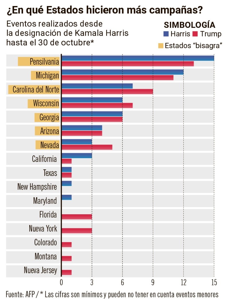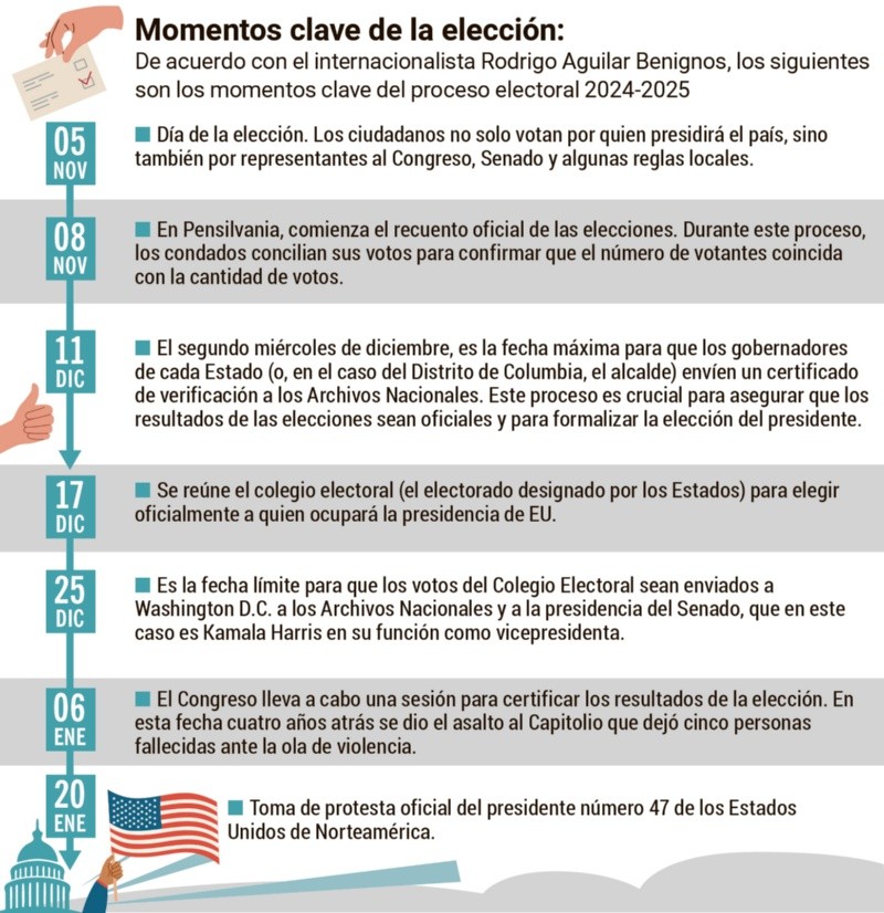 Este martes será la elección a la Presidencia de Estados Unidos (EU) para el periodo 2025-2029. Y Pensilvania y Michigan son los Estados que serán claves para dar el triunfo a Donald Trump o Kamala Harris. Las encuestas han establecido una contienda muy cerrada en cuanto a las preferencias del republicano y la demócrata, quien suplió a Joe Biden luego de que renunciara al proceso electoral en julio pasado.Rodrigo Aguilar Benignos, analista internacional y miembro del Consejo de Relaciones Exteriores de Estados Unidos, indica que, en primer lugar, “Pensilvania será la madre de todas las batallas” porque se trata de un Estado “péndulo”; es decir, que no tiene una tendencia de votación sostenida, sino que fluctúa entre un partido y otro.A Pensilvania se suma Michigan con condiciones similares geográficas, demográficas y económicas. “Hay una zona rural y semi rural bastante significativa. Junto con Wisconsin, aquí Trump y Biden se jugaron la elección, por eso también se explica que las actuales elecciones de sus vicepresidentes, tanto de Kamala Harris como de Donald Trump, sean gente de esa zona, porque ya veían venir esta tendencia en estos Estados”.Otras zonas importantes son Nevada y Arizona, donde ha permeado, la propuesta de Trump de liberar las propinas de impuestos, lo que les beneficia en cuanto al sector servicios que desempeñan, pero donde también tienen una mayor preocupación respecto del tema migratorio, considerando que la estadística refiere que uno de cada cuatro votantes es hispano.“Son zonas pendulares. Por un lado, hay una buena parte muy conservadora, personas que son afines a los republicanos, con temas como el derecho a portar armas, la libertad religiosa, los temas provida y la libertad económica, que son muy atractivos para esas demografías. Pero, por otro lado, hay una serie de votantes que simpatizan con temas como los derechos reproductivos, el tema económico y el tema migratorio”.Francisco Santana, miembro de la Academia de Relaciones Internacionales de la Universidad Panamericana, indica que Pensilvania es un factor clave de la elección porque representa por sí mismo 19 votos de los que se requieren en el Colegio Electoral, lo cual lo convierte en uno de los Estados con mayor peso. Para ganar la Presidencia, un candidato necesita al menos 270 de los 538 votos electorales.Según lo dictado por la estadística electoral, Pensilvania ha sido el voto ganador en ocho de las 10 últimas elecciones en EU. “Pensilvania no es como California, que siempre vota por el Partido Demócrata, o Texas, que siempre vota por el Republicano. Es uno de los Estados péndulo: aunque tradicionalmente había sido demócrata, votaron por Trump en 2016 y posteriormente por Biden en 2020. Por eso es un Estado donde más se han enfocado ambos candidatos, especialmente Trump”.Al Sur, también serán claves Arizona y Georgia, donde el tema migratorio tiene gran peso. En general, los Estados claves son Pensilvania, Nevada, Michigan, Arizona, Wisconsin, Illinois y Georgia, agrega Eduardo González Velázquez, investigador y politólogo del Tecnológico de Monterrey, campus Guadalajara. “En unas elecciones votan por los demócratas y en otras votan por los republicanos. No son Estados abiertamente definidos”.Más de 240 millones de personas están habilitadas para votar, una cifra que refleja la magnitud del sistema democrático estadounidense. 1.- Voto popular 2.- Colegio Electoral 3.- ¿Por qué se usa el Colegio Electoral? Las últimas encuestas dadas a conocer ayer muestran una carrera reñida entre la candidata demócrata a las presidenciales, Kamala Harris, y su contrincante republicano, Donald Trump.Una nueva encuesta de NBC News revela que la vicepresidenta y el ex presidente están prácticamente empatados a nivel nacional entre los votantes registrados.En los sondeos en los que se incluye a senadores y legisladores de la Cámara baja, el 47% apoya a Trump y el 46% a Harris, mientras que en las encuestas que solo tienen en cuenta a los dos candidatos presidenciales, están empatados con un 49% cada uno.No obstante, la última encuesta nacional de ABC News/Ipsos muestra que la vicepresidenta Harris tiene una estrecha ventaja sobre el magnate republicano, con un 49% frente a un 46 por ciento de apoyo a Trump.Con los resultados de la nueva encuesta incorporada, el último promedio de sondeos nacionales de CNN Poll of Polls revela que el 48% de los votantes en todo el país respaldan a Harris y el 47% apoyan a Trump, sin cambios con respecto al promedio anterior.En los siete Estados con más probabilidades de decidir la elección presidencial de este año, conocidos como Estados “bisagra”, ni Harris ni Trump logran una ventaja clara, ya que están empatados en la mayoría de ellos, según las encuestas finales del New York Times/Siena College.Si se analizan los resultados de los cara a cara que tienen en cuenta a los candidatos de terceros partidos, las encuestas indican que Harris y Trump están empatados en Georgia (46 % cada uno), Michigan (45% cada uno) y Pensilvania (47% cada uno) entre los posibles votantes de esos Estados, que en conjunto valen 50 votos electorales en las elecciones de mañana.Harris tiene el 48% frente al 45% de Trump tanto en Wisconsin como en Carolina del Norte, y el 48% frente al 46% de Trump en Nevada, brechas que están dentro del margen de error de cada encuesta que sugieren que no hay un líder claro.EFE El candidato republicano a la presidencia, el ex presidente Donald Trump, y su rival demócrata, la vicepresidenta Kamala Harris, continuaron ayer librando una maratónica batalla por un puñado de Estados determinantes, a dos días de las elecciones presidenciales, con encuestas que presentan un escenario muy ajustado.Trump se centró en sembrar dudas sobre el sistema de votación en algunos Estados claves, algo que podría desembocar, como en 2020, en un nuevo cuestionamiento de los resultados, mientras que