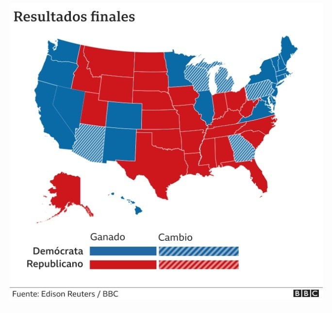 El exvicepresidente Joe Biden sigue ampliando su ventaja sobre Donald Trump con la proyección este viernes de su victoria en Georgia.Con este estado, el candidato demócrata suma 16 votos adicionales en el Colegio Electoral y escala hasta los 306, 36 más de los requeridos para ganar la presidencia.En la noche del jueves, Biden también fue declarado ganador en Arizona, estado tradicionalmente conservador que solo dos demócratas habían ganado previamente.Este viernes también se proyectó la victoria de Trump en Carolina del Norte, con lo que cuenta con 232 votos del Colegio Electoral.La victoria de Biden ha sido puesta en duda por Trump, quien ha denunciado la existencia de un supuesto fraude electoral aunque no ha aportado evidencias.Usualmente, el nombre del ganador de las elecciones presidenciales estadounidenses se conoce la misma noche de la jornada electoral, que en esta ocasión fue el 3 de noviembre.Sin embargo, los comicios este año han sido más complejos de lo usual pues se vieron afectados por la pandemia del coronavirus, que impulsó a millones de ciudadanos a votar por correo o de forma anticipada.Se estima que unos 100 millones de estadounidenses habían ejercido su derecho de esta forma antes de la fecha de la elección.Esta cifra sin precedentes impactó en el proceso de cómputo de resultados pues en algunos estados no se permitió contar estos votos sino hasta el mismo día o, incluso, hasta después de concluida la jornada electoral.Eso es lo que, en parte, explica que se haya tardado tanto en los resultados definitivos de todos los estados.El otro elemento que ha dado mayor complejidad a estos comicios ha sido la negativa de Trump a reconocer las proyecciones que le otorgan la victoria a Biden, así como numerosos recursos jurídicos interpuestos por su equipo de campaña para impugnar los resultados.Ahora puedes recibir notificaciones de BBC Mundo. Descarganuestra app y actívalas para no perderte nuestro mejor contenido.¿Ya conoces nuestro canal de YouTube? ¡Suscríbete!OA