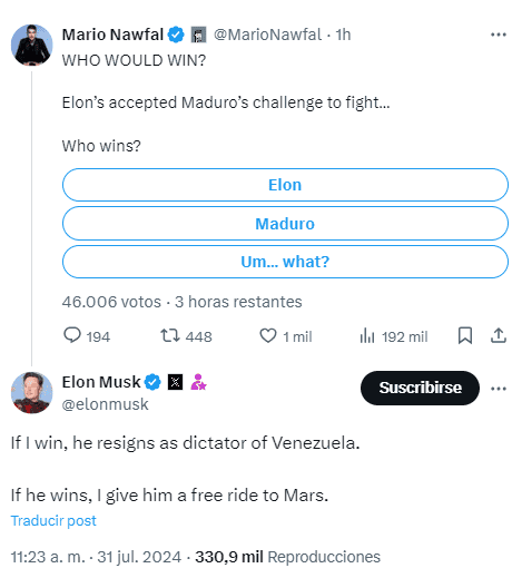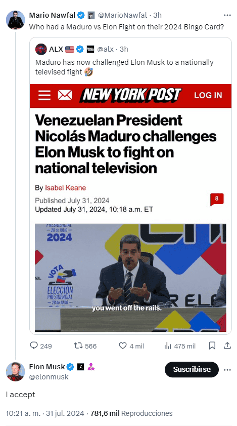 El millonario Elon Musk, que ayer protagonizó una trifulca en redes sociales con Nicolás Maduro, aceptó hoy miércoles 31 de julio el reto de este último y dijo estar dispuesto a pelear con el presidente de Venezuela, a quien definió como "un tipo corpulento que seguro sabe cómo luchar".Fue Nicolás Maduro quien, tras calificar a Musk de "nuestro nuevo archienemigo", le dijo en un acto público: "Elon Musk, ¡quien se mete conmigo, se seca! (...) ¿Quieres pelea? ¡No te tengo miedo!, donde quieras, en los barrios... ¡Si tú quieres, yo quiero!".Este miércoles, Elon Musk aceptó la pelea en su cuenta de X y estableció sus condiciones: "Si gano yo, él dimite como dictador de Venezuela; si gana él, le invito a un viaje gratis a Marte", una alusión a su empresa Space X de cohetes espaciales.Incluso reposteó una encuesta de un seguidor suyo en la que anima a los internautas a votar por quién ganará en esa pelea.No olvidó aludir a otra famosa pelea de "artes marciales mixtas" dentro de una jaula, que él mismo fomentó hace unos meses, contra Mark Zuckerberg, el fundador de Facebook y uno de sus mayores rivales en el mundo de la tecnología, encuentro que nunca llegó a realizarse.Comparando a Maduro con Zuckerberg, dijo que frente a un Maduro corpulento, "Zuck es un hombrecillo, así que sería una pelea rápida, LOL (acrónimo en inglés para carcajada)".*Mantente al día con las noticias, únete a nuestro canal de WhatsAppOF