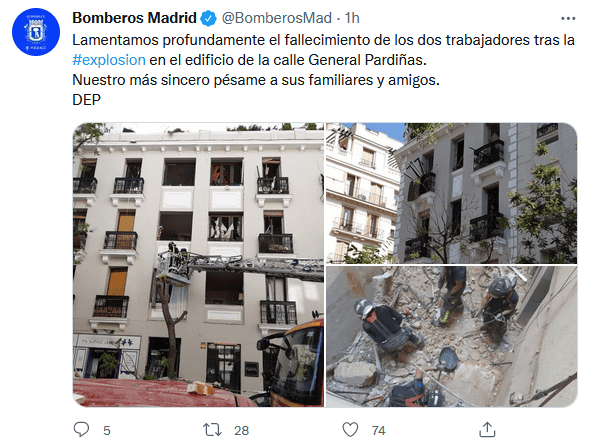 Dos operarios murieron y 18 personas resultaron heridas tras una fuerte explosión originada este viernes en el ático de un edificio de cuatro plantas en una céntrica zona de Madrid, presuntamente por un escape de gas.Las víctimas son dos hombres de 27 y 21 años, uno español y otro hondureño, cuyos cuerpos fueron localizados por los bomberos entre los escombros de un sótano del inmueble horas después de la explosión, según confirmó el alcalde de la ciudad, José Luis Martínez-Almeida.Al parecer, detalló el regidor, los dos operarios estaban trabajando en el edificio siniestrado y sus compañeros, que pudieron salir después del derrumbe, dieron la pista de dónde podían estar.Según Martínez-Almeida, momentos antes de la explosión, los trabajadores habían percibido "el olor" a gas, por lo que habían bajado a un patio para "tratar de cerrar la llave".Según indicaron a Efe fuentes de Emergencias Madrid, el escape de gas es la hipótesis principal con la que se trabaja.Ahora, la prioridad fundamental es "apuntalar el edificio" para que no haya riesgo estructural, adelantó el alcalde, quien confirmó que se han desalojado también los edificios colindantes por recomendación de los servicios técnicos municipales, para poder estudiar la situación por "precaución".El edificio siniestrado se encuentra en pleno barrio de Salamanca, una de las zonas más acomodadas de la capital.El alcalde madrileño detalló que cuatro de los heridos fueron trasladados a centros hospitalarios, entre ellos el único grave, una persona que inicialmente no había sido localizada al salir despedida y caer en un patio, comentó el regidor.Algunos de los vecinos heridos fueron atendidos en un hospital de campaña instalado en el lugar.La explosión se registró a las 13:30 hora local (12:30 GMT) y provocó daños también materiales en mobiliario urbano y vehículos estacionados en la zona.Fuentes de Emergencias Madrid confirmaron que un colegio muy próximo al lugar de la explosión no tuvo que ser evacuado, con lo que los alumnos y el personal docente permanecieron en su interior. OA