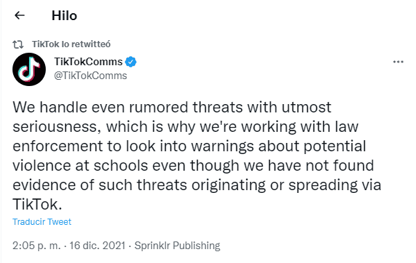 El FBI ya está investigando las amenazas que aparecieron en la red social TikTok, las amenazas son de ataques múltiples con armas de fuego a distintas escuelas, los centros educativos de todo el país enviaron alertas a los padres.Los distritos escolares y la policía minimizaron la credibilidad del vídeo que se viralizó en TikTok, donde se anunciaron varios ataques a escuelas de todo el país.Aún así, muchas escuelas enviaron avisos a los padres de los alumnos, pues la amenaza se produjo a poco más de dos semanas después de que cuatro estudiantes fuesen víctimas letales de un tiroteo en una escuela secundaria de Oxford, en Michigan."Hay información circulando de que hoy puede ser un día de ataques a las escuelas. La administración y la policía de DC están muy conscientes de esto y muy atentas", señalaba el mensaje que se envió a los padres por una escuela de Takoma Park, en Washington.Por su parte, el distrito escolar de Pennsbury, en Pensilvania, dijo a los padres que aunque no creen que la amenaza sea creíble, habría mayor presencia policial alrededor de las escuelas."Manejamos incluso los rumores de amenazas con la mayor seriedad, por lo que estamos trabajando con las fuerzas del orden para investigar las advertencias sobre posibles actos de violencia en las escuelas", dijo la compañía en un comunicado."No hemos encontrado evidencia de que tales amenazas se originen o se propaguen a través de TikTok", agregó el mensaje de todas formas.DO