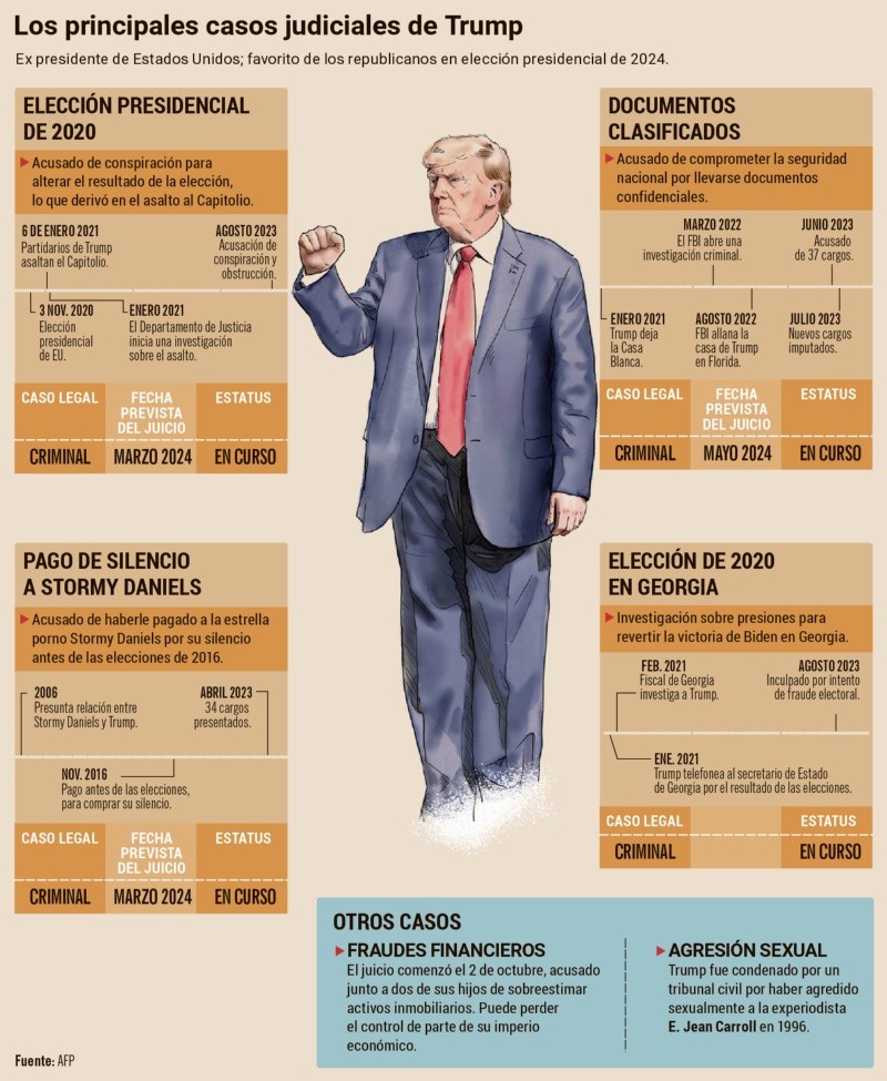 El ex presidente estadounidense Donald Trump (2017-2021) recibió ayer la decisión del Tribunal Supremo de Colorado de expulsarlo de las primarias republicanas en ese Estado, indicó el diario The Washington Post. Su equipo legal presentó el recurso ante el Supremo estadounidense un día después de apelar ante el Tribunal Superior de Kennebec una decisión similar en Maine.En ambos estados se consideró que el ex mandatario y de nuevo candidato electoral no se puede postular a un segundo mandato en la Casa Blanca en virtud de la sección 3 de la Enmienda XIV de la Constitución por haber participado en una “insurrección”. El veto del Supremo de Colorado fue anunciado el 19 de diciembre. Fue una decisión sin precedentes y relacionada con el ataque al Capitolio del 6 de enero de 2021, que tuvo lugar mientras se certificaba la victoria electoral del demócrata Joe Biden sobre Trump.Posteriormente, el 28 de diciembre, Maine se convirtió en el segundo Estado en descalificar a Trump. En este caso, la decisión fue tomada por la secretaria de Estado de Maine, la demócrata Shenna Bellows, que es la autoridad encargada de organizar las elecciones en esa circunscripción.“Las cuestiones presentadas en esta petición son de una importancia excepcional y requieren urgentemente una pronta resolución de este tribunal”, alegaron los abogados de Trump en su recurso ante el Supremo. En su opinión, la decisión del Supremo de Colorado, de aplicarse, “privaría inconstitucionalmente de sus derechos a millones de votantes en Colorado y probablemente se usaría como modelo para privar de sus derechos a decenas de millones de votantes en todo el país”. El recurso subraya que Estados Unidos tiene un largo historial de protestas políticas que se volvieron violentas y afirma “nada de lo que hizo Trump fue una insurrección”, por lo que no hay razón para invocar esa enmienda.La sección 3 de la enmienda XIV estipula que no podrá ser senador o representante en el Congreso, ni elector para elegir presidente y vicepresidente, (...) quien habiendo jurado previamente defender la Carta Magna haya tomado parte en alguna insurrección o rebelión contra Estados Unidos o haya prestado ayuda o facilidades a enemigos del país. El párrafo no menciona explícitamente el cargo de presidente, pero en el sistema federal estadounidense cada estado es responsable de organizar los comicios, incluso los presidenciales, y tiene así la potestad de expulsar a un candidato aunque este no haya sido imputado, restándole apoyos en la contienda general.Los abogados de Trump argumentaron ayer sobre Maine que la decisión de Bellows fue “el producto de un proceso infectado por la parcialidad y la falta generalizada del debido proceso”, así como que “es arbitraria, caprichosa” y que “no está respaldada por pruebas sustanciales en el expediente”. Tanto en Maine como en Colorado las primarias tendrán lugar el próximo 5 de marzo, día conocido como supermartes porque más de una decena de estados republicanos y demócratas celebran simultáneamente primarias para escoger qué candidato les representará en las presidenciales.EFE El ex presidente Donald Trump sufrió ayer un nuevo revés judicial cuando la Corte de Apelaciones Federal para el Segundo Circuito de Nueva York rechazó su petición para que se aplace el juicio civil en el que se decidirá cuánto debe pagar a E. Jean Carroll por un caso de difamación. Carroll acusó a Trump de haberla violado a mediados de la década de los noventa.El juicio está previsto para el 16 de enero ante el juez Lewis Kaplan, de la corte federal para el Distrito Sur de Nueva York, a menos que el Tribunal Supremo estadounidense acepte la apelación del ex mandatario (2017-2021), quien alega que estaba protegido por la inmunidad presidencial cuando hizo los comentarios.En mayo del año pasado, un jurado halló a Trump responsable por abuso sexual y difamación de Carroll. Según indicó el juez Kaplan, en este nuevo juicio solo se debe decidir la cantidad que debe recibir la escritora por daños y perjuicios.Kaplan dictaminó que Trump no tenía inmunidad presidencial, pese a que estaba en la Casa Blanca cuando Carroll hizo pública su denuncia en un libro en 2019.EFE Las primarias republicanas son un proceso en el cual los miembros del Partido Republicano en los Estados Unidos participan para seleccionar a sus candidatos oficiales para las elecciones generales. Estas primarias suelen celebrarse antes de las elecciones generales y son una parte fundamental del proceso democrático en el sistema político estadounidense.Durante las primarias, los votantes registrados del Partido Republicano tienen la oportunidad de elegir a su candidato preferido para diferentes cargos, como presidente, gobernador, senador, representante, entre otros. Los candidatos seleccionados en las primarias luego representarán al partido en las elecciones generales, compitiendo contra los candidatos de otros partidos.Es importante destacar que las primarias son un proceso interno de cada partido político, y cada partido tiene sus propias reglas y procedimientos para llevar a cabo estas elecciones internas. Las primarias republicanas suelen ser una parte crucial en el proceso de nominación del candidato presidencial del Partido Republicano, determinando quién será el contendiente oficial del partido en la elección presidencial.Las primarias republicanas son un mecanismo para que los miembros del Partido Republicano elijan a sus candidatos para competir en las elecciones generales y representar al partido en diferentes niveles de Gobierno. CT