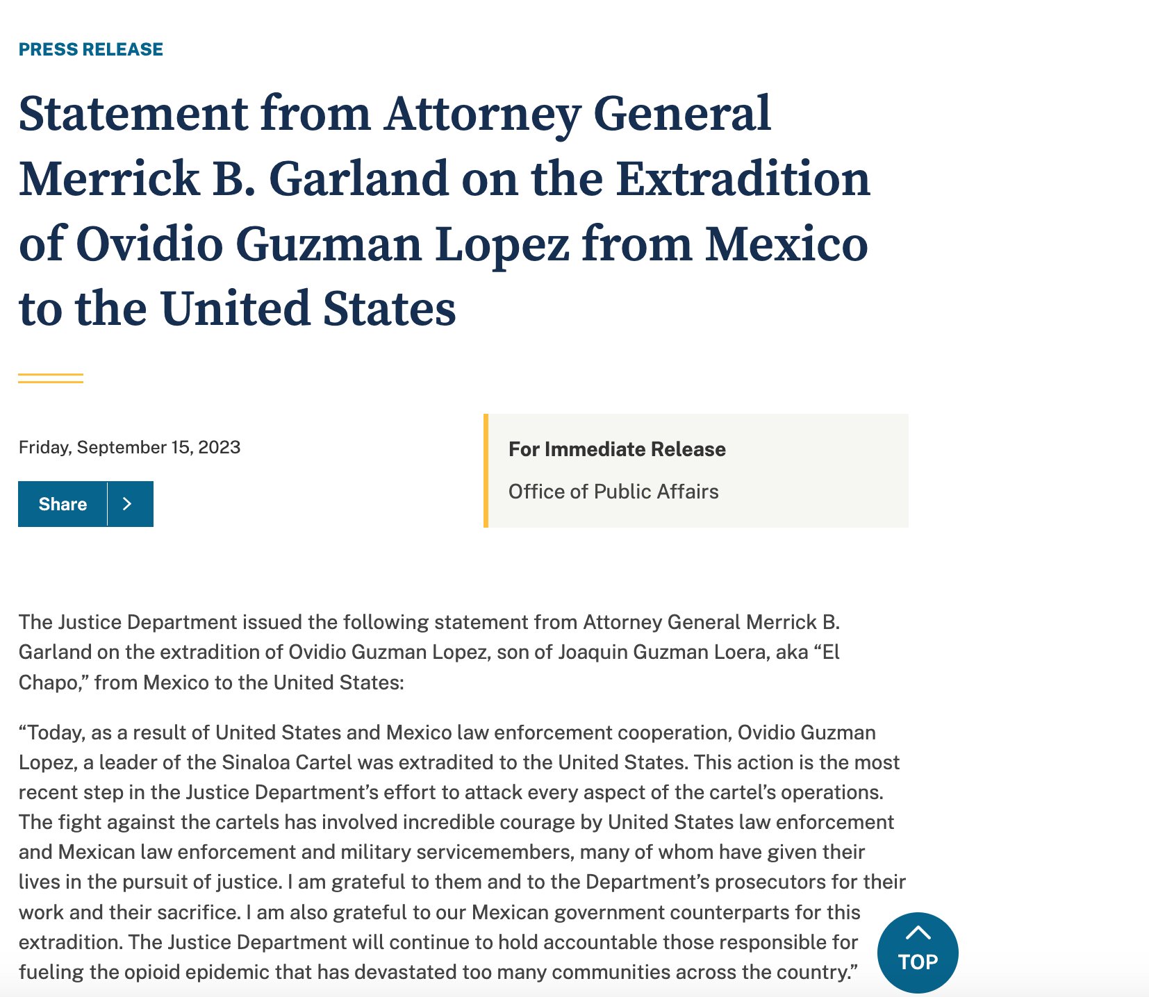 Durante la tarde de este viernes, Ovidio Guzmán López fue trasladado del penal del Altiplano por agentes de Interpol con el objetivo de entregarlo a las autoridades estadounidenses en cumplimiento de un proceso de extradición.Presuntamente el gobierno mexicano entregó en extradición a autoridades de Estados Unidos a Ovidio Guzmán Salazar, considerado uno de los principales productores y distribuidores de fentanilo, y uno de los líderes del Cártel de Sinaloa, de acuerdo con información difundida por diversos medios estadounidenses, entre ellos el Chicago Sun TimesABC News y Chicago Tribune.De acuerdo con la información obtenido de fuentes federales mexicanas, Guzmán Salazar, también conocido como "El Ratón" habría sido sacado del Centro Federal de Readaptación Social número 1, Altiplano, en Almoloya de Juárez, Estado de México poco después de las diez de la mañana. A bordo de un helicóptero fue trasladado al Aeropuerto Internacional de Toluca, donde a las 11 de la mañana comenzó el vuelo en avión a la termial aérea de Terboro, en Nueva Jersey.El Departamento de Justicia emitió la siguiente declaración del Fiscal General Merrick B. Garland sobre la extradición de Ovidio Guzmán López, hijo de Joaquín Guzmán Loera, alias "El Chapo", de México a Estados Unidos:"Hoy, como resultado de la cooperación policial entre Estados Unidos y México, Ovidio Guzmán López, líder del Cartel de Sinaloa, fue extraditado a Estados Unidos. Esta acción es el paso más reciente en el esfuerzo del Departamento de Justicia para atacar todos los aspectos de las operaciones del cartel. La lucha contra los cárteles ha implicado un valor increíble por parte de las fuerzas del orden de Estados Unidos y de los miembros del servicio militar y de las fuerzas del orden mexicanas, muchos de los cuales han dado sus vidas en la búsqueda de la justicia. Les agradezco a ellos y a los fiscales del Departamento por su trabajo y su sacrificio. También agradezco a nuestros homólogos del gobierno mexicano por esta extradición. El Departamento de Justicia seguirá responsabilizando a los responsables de alimentar la epidemia de opioides que ha devastado demasiadas comunidades en todo el país".MM