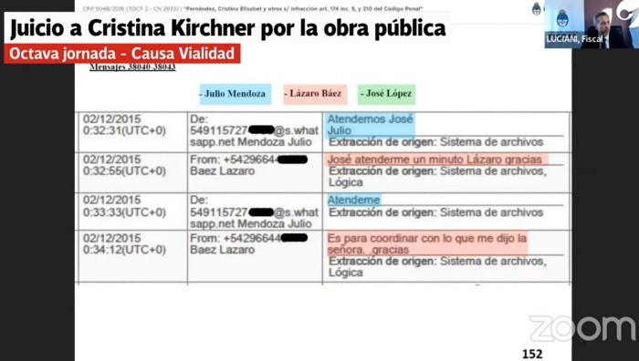 El caso de red de corrupción por la que el empresario argentino Lázaro Báez fue condenado en 2021, continúa sumando implicado y pruebas.En esta ocasión, el fiscal Diego Luciani retomó el día de hoy las acusaciones en el juicio que actualmente atraviesa la exmandataria de Argentina, Cristina Kirchner, y rechazó toda teoría sobre una supuesta persecución en contra de la exfuncionaria, y mencionó que ella intervino para beneficiar ilegalmente al empresario Lázaro Báez.Diego Luciani dirigió su exposición a intentar demostrar la profundidad del vínculo entre Lázaro Báez y la familia Kirchner, y para ello, exhibió un testamento que, según él, confirma que Báez no era dueño de la riqueza a su nombre y recordó operaciones comerciales compartidas por el empresario y el matrimonio presidencial.Esta es la octava audiencia en la que exponen Luciani y el fiscal que colabora con él, Sergio Mola, para argumentar los pedidos de pena que formularán el próximo lunes 22 de agosto. Una vez finalizada la exposición de la fiscalía, el Tribunal Oral Federal 2 comenzará los alegatos de las defensas. En total hay 13 acusados en este caso.Apenas dio inicio la audiencia, el fiscal se refirió a la jornada anterior, en la cual expuso correspondencia del exsecretario de Obras Públicas José López y al peritaje realizado sobre su celular.“Hemos dejado al descubierto la intervención de Cristina Fernández, Julio De Vido y Abel Fatala, entre otros, para beneficiar a Lázaro Báez y sus empresas”, señaló al respecto.Posteriormente, expuso en la pantalla compartida intercambios de mensajes entre el mismo José López y Julio Mendoza, quien por entonces era presidente de Austral Construcciones.Algunos de esos mensajes, los cuales fueron publicados por un periódico nacional de Argentina, ya habían sido mostrados en las primeras audiencias del alegato.El fiscal exhibió nuevamente los mensajes entre José López y Julio Mendoza con fecha del 30 de noviembre de 2015, entre los que hacen referencia a una reunión entre Lázaro Báez y “la Sra”.“Ese día, según los portales de noticias, Cristina estaba en el Sur”, mencionó el fiscal Luciani. “Después de haber visto la elocuencia de estos mensajes, sobran las palabras”, apuntó.Diego Luciani dijo hoy que tanto los exfuncionarios de la Secretaría de Obras Públicas, el presidente del Banco Nación, los entonces funcionarios de la Dirección Nacional de Vialidad y los colaboradores de Lázaro Báez mantenían un vínculo “codo a codo”.“Eran lisa y llanamente como una misma parte (...) a costa de los fondos del erario”, apuntó Luciani, y una vez más refirió al “canal privilegiado” que tenía Lázaro Báez.“Austral [Construcciones] fue una estructura creada para extraer fondos del estado mediante el direccionamiento de licitaciones –mencionó el fiscal-. Tal es así que cuando concluyó el mandato de Cristina [Fernández] Kirchner la empresa desapareció, se esfumó. Porque Austral Construcciones solo podía subsistir con el amparo y la anuencia de la entonces presidenta. Y se ve en los procesos de quiebra que atravesó la empresa”, apuntó Diego, y repasó el proceso de bancarrota de la empresa.“Austral Construcciones fue una cáscara, que más allá de las personas que nominalmente aparecen o aparecieron como accionistas fue creada por personas con capacidad organizativa para direccionar licitaciones financiadas por el tesoro nacional”, añadió.A manera de cuestionamiento, mencionó que las empresas de Lázaro Báez recibieron anticipos financieros por mil millones de pesos entre 2005 y 2012, pero que ese dinero fue usado para la adquisición de estancias y no para avanzar con la ejecución de las obras.“Lázaro Báez era Néstor Kirchner”, aseguró. Mencionó el vínculo existente entre Lázaro Báez y los expresidentes del Banco Nación Juan Carlos Fabrega y Juan Ignacio Forlón, a quien se refirió como “cercano a Máximo Kirchner”.Sin embargo, en lugar de abordar el direccionamiento de las obras, el fiscal Luciani se enfocó en la relación entre Báez y la familia Kirchner.“Austral tiene un terreno con vista al lago en El Calafate en condominio con los hijos de Cristina Kirchner. Además, hay propiedades que Lázaro Báez le compró a Máximo Kirchner”, mencionó.Luego de hablar de las operaciones comerciales que unen a Báez y los Kirchner, se refirió también a la declaración de Leonardo Fariña como arrepentido en la causa conocida como “la ruta del dinero o "K-Money", de los Kirchner.Asimismo, exhibió un ingreso de Báez a la Quinta de Olivos con fecha del 2 de diciembre de 2010. “Solo aparece su nombre y nada más. Pero no es la única visita que recibió Cristina Kirchner por parte de Austral Construcciones. Unos meses antes, el 10 de agosto de 2010, José López ingresa a las 10:15 horas, se va 11:25 y en esa misma reunión estaba Julio Mendoza”.De acuerdo con el testamento de Lázaro Báez, el cual también fue exhibido por el fiscal Diego Luciani, se establece que durante 30 años los herederos del empresario, su esposa y sus hijos, no podían disponer de la herencia. “Báez no tenía poder de decisión absoluto sobre el destino de sus propios bienes y de sus empresas, por lo tanto, ¿quién concretamente detentaba ese poder?”, interrogó el fiscal.Por si las pruebas no fueran pocas, el fiscal Diego Luciani denunció que Lázaro Báez era dueño de 415 mil hectáreas, sólo en la provincia de Santa Cruz, lo cual equivaldría a la extensión de 20 ciudades de Buenos Aires.Luciani descargó directamente contra Báez, que en realidad era Cristina Kirchner y su familia, a través de Austral Construcciones, y hace un llamado urgente al presidente de Argentina, Alberto Fernández, a poner atención a estos datos. Los Kirchner se enriquecieron de manera ilegal durante 12 años a través de la constructora de BáezAsimismo, hizo una fuerte crítica y nombra a Báez, a
