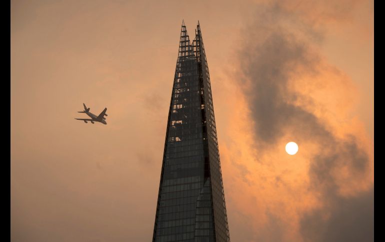 Un avión pasa por el edificio Shard en Londres. La oficina meteorológica del Reino Unido dijo que se deben tanto al polvo procedente del Sahara que ha arrastrado "Ofelia" como a partículas de los incendios en Portugal y España. AP/D. Lipinski