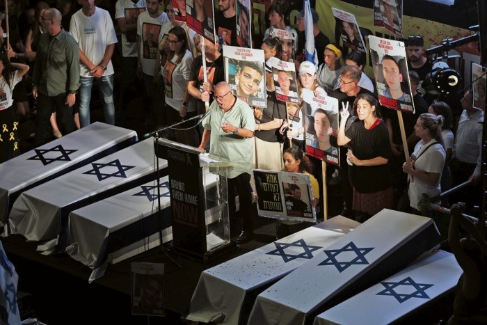 Decenas de miles de israelíes, afligidos y enojados, salieron a las calles ayer por la noche tras el hallazgo de otros seis rehenes muertos en Gaza. Coreando “¡Ahora! ¡Ahora!”, exigieron al primer ministro Benjamín Netanyahu que logre un cese al fuego con Hamás para traer de vuelta a los rehenes restantes a Israel.La protesta masiva pareció ser la mayor de su tipo en 11 meses de guerra. Los manifestantes la consideraron un posible punto de inflexión, aunque el país se encuentra profundamente dividido.El mayor sindicato de Israel, la Histadrut, incrementó la presión sobre el Gobierno convocando a una huelga general para hoy, la primera desde el ataque de Hamás del 7 de octubre de 2023, que desató la guerra. El objetivo de la huelga es paralizar o afectar los principales sectores de la economía, incluidos la banca, los servicios de salud y el principal aeropuerto del país.Las negociaciones para un cese al fuego se han prolongado durante meses. Muchos culpan a Netanyahu de no haber logrado un acuerdo, algo que la mayoría de los israelíes desea, según sondeos de opinión. No obstante, el primer ministro también cuenta con un apoyo significativo para su estrategia de “victoria total” contra Hamás, aunque esto implique que un acuerdo para recuperar a los rehenes deba esperar.Miles de personas, algunas de ellas llorando, se congregaron ayer por la noche frente a la oficina de Netanyahu en Jerusalén. En Tel Aviv, familiares de los rehenes desfilaron con ataúdes que simbolizaban a los rehenes muertos.“Verdaderamente pensamos que el Gobierno está tomando estas decisiones para protegerse a sí mismo y no para salvar la vida de los rehenes. Necesitamos decirles: ‘¡Basta!’”, dijo Shlomit Hacohen, residente de Tel Aviv.Al parecer, tres de los seis rehenes encontrados muertos —entre ellos un estadounidense de origen israelí— iban a ser liberados en la primera fase de una propuesta de cese al fuego debatida en julio, lo que solo aumentó la furia y frustración de los manifestantes.“No hay nada peor que saber que podrían haberse salvado”, afirmó Dana Loutaly. “A veces, hace falta que suceda algo tan horrible para sacudir a la gente y lograr que salga a protestar”.El Ejército israelí señaló que los rehenes fueron asesinados poco antes de la llegada de las fuerzas que trataban de rescatarlos.“Quien asesina rehenes no quiere un pacto”, dijo Netanyahu, culpando a Hamás del estancamiento de las negociaciones.AP El Ministerio de Salud israelí informó que las autopsias concluyeron que los rehenes fueron baleados a quemarropa y murieron entre el jueves y el viernes. Según el Ejército, los cadáveres fueron recuperados en un túnel de la ciudad de Rafah. CT