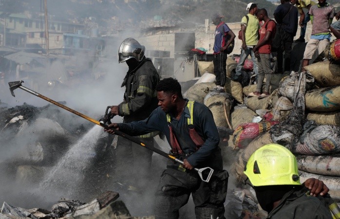 Un voraz incendio estalló en un mercado callejero de Haití el jueves en la madrugada, consumiendo gran cantidad de mercancías y provocando angustia entre los vendedores.El hecho se registró en un mercado conocido como Shada está ubicado en Petionville, cerca de la capital, Puerto Príncipe.Los vendedores llegaron antes del amanecer y trataron de apagar las llamas, lanzando cubos de arena contra los techos antes de que llegasen los bomberos.Stevenson Midi, de 42 años, dijo que perdió cientos de dólares en productos como plátanos, y que él y los otros comerciantes estaban preocupados por sus préstamos bancarios."Ahora será más difícil pagar", expresó al tiempo que contemplaba las ruinas humeantes a su alrededor.Mientras hablaba, otros caminaban cerca gritando "¡¿Por qué me ha sucedido esto?!" y "¡¿Qué hicimos mal?!".Un bulldozer llegó y empezó a despejar los escombros.El mercado es popular entre la comunidad y cientos de comerciantes venden allí bananas, carbón, batatas, espinaca y otros productos.No estaba claro qué causó el incendio, que ocurre en momentos en que la pobreza y el hambre van en aumento en Haití, que ya estaba afectada por la inestabilidad política y la violencia pandillera. AH