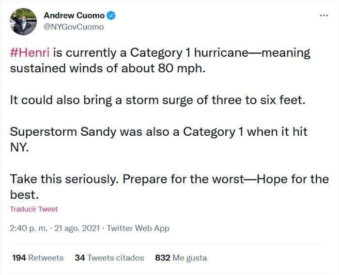 La tormenta tropical "Henri" se convirtió en un huracán de categoría 1 el sábado y se prevé que toque tierra en la costa noreste de Estados Unidos el domingo, informó el Centro Nacional de Huracanes (NHC)."Es tan grave como un ataque cardíaco", dijo el gobernador de Nueva York, Andrew Cuomo, al anunciar el estado de emergencia y el despliegue preventivo de 500 soldados de la Guardia Nacional.Cuomo señaló que se espera que el huracán toque tierra en Long Island, donde se encuentran los lujosos Hamptons, donde muchos neoyorquinos adinerados pasan el verano, alrededor del mediodía local del domingo."Será un evento de aproximadamente 26 horas", agregó Cuomo, y advirtió a los neoyorquinos que esperen "cortes de energía significativos" e "inundaciones significativas" en algunos suburbios de la Gran Manzana.El Centro Nacional de Huracanes de Estados Unidos, en su último boletín, advirtió de "una peligrosa marejada ciclónica, condiciones de huracán e inundaciones" en áreas del sur de Nueva Inglaterra y Long Island.Con vientos de hasta 120 km/h actualmente, "Henri" provocará entre siete y 15 centímetros de precipitaciones en toda la región, y hasta 25 centímetros en algunos lugares, estimó el NHC, al advertir del riesgo de inundaciones.Una parte del noreste de Estados Unidos, incluyendo Nueva York, fue puesta en alerta el viernes por "Henri", que podría convertirse en el primer huracán en 30 años en llegar a la costa de Nueva Inglaterra.Si te interesó esta noticia y quieres saber más, entonces descarga y descubre INFORMAPlus, la aplicación digital de EL INFORMADOR, en donde tenemos contenidos exclusivos, seleccionados por nuestros editores, para darles una experiencia más completa a los lectores. Si eres suscriptor de EL INFORMADOR tu acceso está incluido, solicítalo al 33 3678-7777Descarga la aplicación y pruébala GRATIS por treinta días.Para iOS: https://apple.co/35jaVgbPara Android: https://bit.ly/3gwVSEVJM