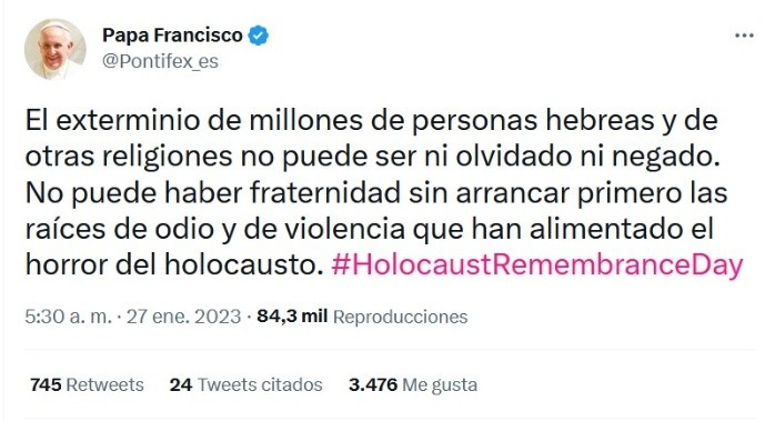 El papa Francisco conmemoró este viernes el Día Internacional en Memoria de las Víctimas del Holocausto con un mensaje en las redes sociales en el que pidió "no olvidar ni negar" el asesinato de millones de judíos perpetrado por el régimen de la Alemania nazi."El exterminio de millones de personas hebreas y de otras religiones no puede ser ni olvidado ni negado", apuntó el pontífice en el mensaje a sus seguidores en Twitter."No puede haber fraternidad sin arrancar primero las raíces de odio y de violencia que han alimentado el horror del Holocausto", añadió Jorge Mario Bergoglio en sus cuentas sociales en español, inglés, italiano, alemán y portugués.Este viernes se celebra el Día Internacional en Memoria de las Víctimas del Holocausto -que causó la muerte de unos seis millones de judíos a manos del régimen nazi en Alemania- y se conmemora la liberación en 1945 del campo de concentración y exterminio de Auschwitz-Birkenau.Además del papa, otros líderes enviaron mensajes de recuerdo a las víctimas de los nazis con motivo de la celebración del Día Internacional en Memoria de las Víctimas del Holocausto, como el primer ministro israelí, Benjamín Netanyahu, o el mandatario ucraniano de origen judío, Volodímir Zelenski.Los judíos "no olvidan ni perdonan a los malvados negadores del Holocausto, para quienes un único Holocausto no fue suficiente", dijo el mandatario israelí, mientras Zelenski enfatizó que "la indiferencia, junto con el odio, matan".JM