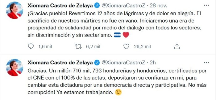 Poco después de la declaratoria, la presidenta electa agradeció a los hondureños que le dieron el apoyo para ganar las elecciones. "¡Gracias pueblo! Revertimos 12 años de lágrimas y de dolor en alegría", escribió en referencia al conservador Partido Nacional, que ha estado en el poder por algo más de una década tras la administración de Porfirio Lobo (2010-2014) y Juan Orlando Hernández (2014-2018 y 2018-2022).