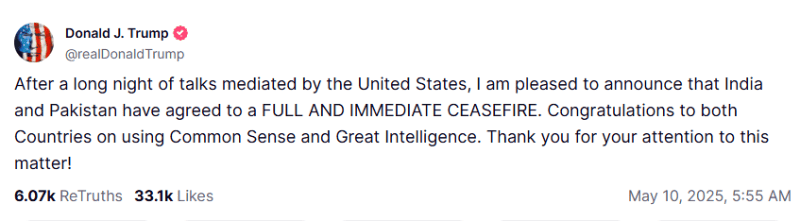 El presidente de Estados Unidos, Donald Trump, anunció hoy sábado 10 de mayo que la India y Pakistán han acordado un alto al fuego "total e inmediato" con la mediación de Estados Unidos, según informó en una publicación en su perfil en la red social Truth Social."Tras una larga noche de conversaciones con la mediación de Estados Unidos, me complace anunciar que India y Pakistán han acordado un ALTO AL FUEGO TOTAL E INMEDIATO. Felicitaciones a ambos países por su sentido común y su gran inteligencia. ¡Gracias por su atención a este asunto!", indica el mensaje.Estados Unidos había transmitido en varias ocasiones estar siguiendo de cerca el conflicto entre la India y Pakistán, que se desató el pasado 22 de abril tras un atentado terrorista en la Cachemira administrada por la India, en el que murieron 26 personas, y del que Nueva Delhi responsabilizó a Pakistán.Además había realizado varios llamados a la calma y a la moderación a ambas partes.La escalada aumentó de forma importante después de que la India bombardeara supuestas bases terroristas en Pakistán el pasado miércoles, un incidente en el que murieron 31 civiles, según Islamabad, que denunció que las zonas atacadas eran poblaciones civiles.En este sentido, Trump se ofreció ese mismo día a mediar entre Nueva Delhi e Islamabad para resolver sus diferencias.El secretario de Estado estadounidense, Marco Rubio, informó en la red social X que tanto él como el vicepresidente de Estados Unidos, JD Vance, habían estado en contacto durante las últimas 48 horas "con altos funcionarios indios y paquistaníes", incluidos los primeros ministros de ambos países.Y agregó que las conversaciones tendrán lugar "en un espacio neutral".Minutos después del anuncio de Trump, el ministro de Asuntos Exteriores de Pakistán, Ishaq Dar, confirmó que este país y la India "han acordado un alto el fuego con efecto inmediato".El secretario de Relaciones Exteriores, Vikram Misri, anunció casi en simultáneo que "ambas partes suspenderían todo fuego y acción militar en tierra, aire y mar a partir de las 17:00 horas. Hoy se han dado instrucciones a ambas partes para hacer efectivo este acuerdo", dijo sin mencionar la mediación de EU.Al menos 98 personas habían muerto durante la actual escalada, que representa la peor crisis entre los dos vecinos nucleares desde la guerra del Kargil de 1999.La India y Pakistán mantienen una histórica confrontación por la soberanía de la región de Cachemira, desde la independencia de ambos países del Imperio británico en 1947.*Mantente al día con las noticias, únete a nuestro canal de WhatsAppOF