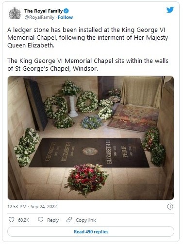 El Palacio de Buckinham difundió este sábado una fotografía que ofrece un primer vistazo a la nueva lápida instalada en la morada final de los restos de la reina Isabel II.La imagen muestra una losa de mármol negro belga tallada a mano con incrustaciones de letras de latón en el piso de la Capilla Memorial del Rey Jorge VI, en el Castillo de Windsor, en Windsor, Inglaterra.La nueva lápida, rodeada de ofrendas florales, tiene inscrito el nombre de Isabel II así como los años de su nacimiento y muerte; también los de su padre, Jorge VI; su madre, Isabel; y su esposo Felipe, que falleció el año pasado.La lápida sustituye a la anterior, que sólo tenía los nombres de los parientes de Isabel II.Estos cuatro miembros de la familia real eran integrantes de la Nobilísima Orden de la Jarretera, que tiene su casa espiritual en la Capilla de San Jorge.TAMBIÉN LEE: Despedida con honores, Isabel II descansa en paz en WindsorLa fotografía fue difundida antes de que el lugar de descanso eterno de la reina reciba a visitantes la semana entrante, cuando el Castillo de Windsor reabra sus puertas al público.Isabel fue sepultada junto al Duque de Edimburgo el lunes en la noche en un servicio privado al que asistió el rey Carlos III y otros miembros de la familia real, después del funeral de Estado que se le dispensó en la Abadía de Westminster y el servicio funerario de despedida en Windsor.JM
