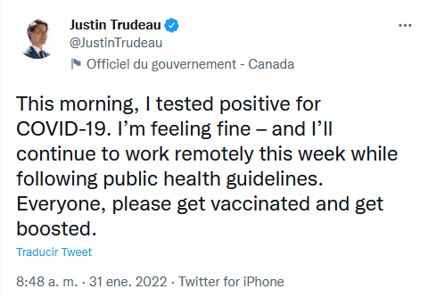 El primer ministro canadiense, Justin Trudeau, anunció hoy lunes 31 de enero que dio positivo a COVID-19, pero que no experimenta síntomas graves."Esta mañana, di positivo por COVID-19. Me siento bien, y continuaré trabajando de forma remota esta semana mientras sigo las pautas de salud pública", publicó el primer ministro en su cuenta de Twitter.También insistió a los canadienses a vacunarse.Trudeau recibió recientemente su tercera dosis de vacunas contra el coronavirus.OF
