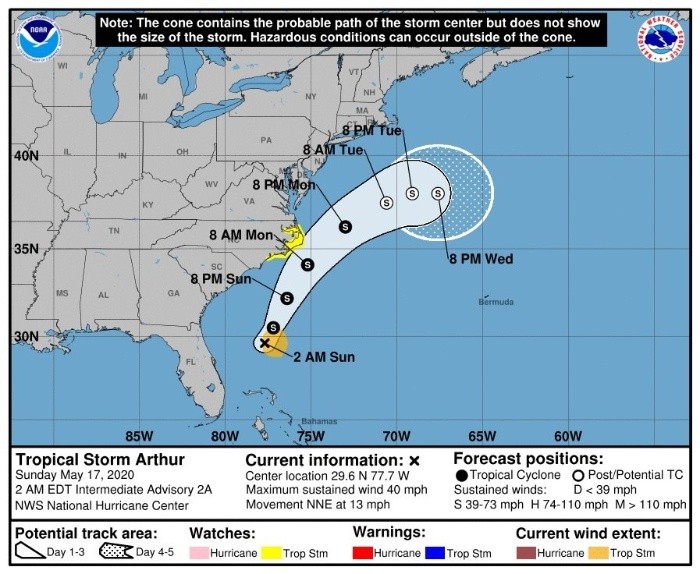 “Arthur”, la primera tormenta tropical de la temporada de huracanes atlántica, que este año se prevé será por "encima de lo normal", avanza en alta mar paralela a las costa sureste de Estados Unidos en camino a Carolina de Norte, informó este domingo el Centro Nacional de Huracanes (NHC).Los meteorólogos señalaron que “Arthur” se desplazará este domingo hacia el norte alejado de las costas de Florida, Georgia y Carolina del Sur, para mañana lunes acercarse a las de Carolina del Norte.La agencia federal, con sede en Miami, emitió un aviso de tormenta para la costa de Carolina del Norte desde Surf City hasta Duck, como también Pamlico y Albemarle Sounds."Arthur" presentaba vientos máximos sostenidos de 65 kilómetros por hora (40 millas) y estaba situado a unos 575 kilómetros (355 millas) a sur suroeste de Cabo Hatteras (Carolina del Norte), según el boletín del NHC de las 8:00 hora local (12.00 GMT).La agencia pronostica cierto fortalecimiento durante los próximos dos días y es probable que “Arthur” pierda sus características tropicales el martes.“Arthur”, que no presenta por ahora ninguna amenaza en tierra, se mueve hacia el norte noroeste a 15 kilómetros por hora (9 millas).Esta tormenta tropical, la primera con nombre, se anticipó al inicio oficial de la temporada del Atlántico, que va del 1 de junio al 30 de noviembre.Desde la formación del sistema, en el Estrecho de Florida, el fenómeno ha ocasionado desde el jueves pasado torrenciales lluvias y fuertes vientos en el sudeste de Estados Unidos.Los meteorólogos del NHC prevén que “Arthur” produzca fuertes lluvias sobre Carolina del Norte la noche del domingo.La Administración Nacional de Océanos y Atmósfera de Estados Unidos (NOAA, en inglés) tiene previsto para el próximo jueves anunciar en Miami su pronóstico inicial para la temporada 2020, que después irá revisando.Sin embargo, otras organizaciones privadas y universidades han anticipado que estará "por encima de lo normal", cuando lo regular es doce tormentas con nombre, de las cuales seis se convierten en huracanes, incluidos tres importantes.La compañía privada de servicios meteorológicos AccuWeather, por ejemplo, pronostica de 14 a 20 tormentas, de las cuales entre siete y once llegarán a ser huracanes, entre estos de cuatro a seis llegarán a categoría mayor, es decir 3, 4 o 5 (la máxima) en la escala de Saffir-Simpson.Por su parte, la Universidad Estatal de Colorado (CSU) pronosticó en abril pasado que la temporada será "superior al promedio anual".Eso es con 16 tormentas con nombre, ocho huracanes y cuatro de ellos de categoría mayor, entre otros, debido a que las temperaturas del Atlántico tropical y subtropical están "más caliente que el promedio de temperatura a largo plazo". AC