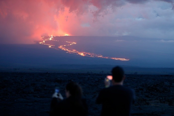 La primera erupción en 38 años del volcán activo más grande del mundo atrae espectadores a un parque nacional en Hawai para las vistas "espectaculares" del suceso, a la vez que despierta en algunos habitantes malos recuerdos de experiencias volcánicas espantosas.Hace apenas cuatro años, Nicole Skilling huyó de su hogar cerca de una población donde la lava destruyó más de 700 viviendas. Se mudó a la zona de South Kona, pero esta semana volvió a cargar provisiones en su auto cuando Mauna Loa entró en erupción el domingo. Las autoridades temían que la lava que fluía por la ladera del volcán iría hacia South Kona, pero los científicos aseguraron luego al público que la erupción migró hacia una zona de grietas en el flanco noreste del Mauna Loa donde no había poblaciones.Con todo, persisten el miedo y la incertidumbre. Aunque no hubo órdenes de evacuación, algunas personas decidieron abandonar sus hogares, y las autoridades habilitaron refugios en las zonas de Kona y Kau. Muy pocos pernoctaron en ellos, dijo el alcalde del condado de Hawai, Ritch Roth, y añadió que ya los estaban cerrando. A pesar de ello, algunos en la zona se preparaban para cambios imprevisibles.Kamakani Rivera-Kekololio, residente de la población de Hookena en South Kona, tenía alimentos y mantas en su auto. "Estamos makaukau (preparados) para cualquier cosa", dijo. Ken Hon, científico jefe del Observatorio Hawaiano de Volcanes, dijo el martes que la lava fluía "no a supervelocidad" a menos 1 mph (1,6 km/h), aunque la velocidad exacta no estaba precisada, descendía a 6 millas (10 kilómetros) del Saddle Road, la vía que conecta los extremos oriental y occidental de la isla.Probablemente se frenaría al llegar a terreno más lento a 6,4 kilómetros (4 millas) del camino. FS
