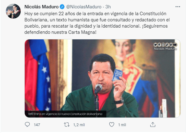Nicolás Maduro celebra este jueves el 22 aniversario de la Constitución de Venezuela y aseguró que desde su gobierno se mantendrá la defensa del texto."Hoy se cumplen 22 años de la entrada en vigencia de la Constitución bolivariana, un texto humanista que fue consultado y redactado con el pueblo, para rescatar la dignidad y la identidad nacional", dijo Maduro en su cuenta de Twitter.En su mensaje, acompañado de una foto del fallecido presidente Hugo Chávez sosteniendo el texto constitucional, Maduro aseguró que desde su gestión seguirán defendiendo la carta magna vigente.El ministro de Defensa, Vladimir Padrino López también celebró el aniversario y dijo que es la "primera Constitución consultada, debatida y aprobada por el pueblo"."Nunca debió haber sido agredida ni anulada por medio de la fuerza por esa facción subversiva que todavía trata de mancillarla ¡Defendamos nuestra Constitución! Garantía de independencia y de unidad nacional", exclamó Padrino López, en referencia al antichavismo.La actual constitución de Venezuela, a la que Chávez presumía como "la más avanzada del mundo", está vigente desde el 30 de diciembre de 1999 y fue creada tras nueve meses de debate y redacción en el seno de una Asamblea Nacional Constituyente.El 30 de julio de 2017, en medio de unas controvertidas elecciones, se eligió una nueva Asamblea Nacional Constituyente que no redactó una nueva Constitución ni reformó la vigente, sino que tomó funciones de la Asamblea Nacional (parlamento) hasta diciembre de 2020, cuando su presidente, Diosdado Cabello, anunció la disolución de la institución.DO