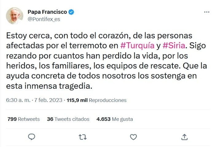 El Papa Francisco aseguró este martes que está "cerca" de las personas afectadas por el terremoto en Turquía y Siria, por los que pidió que la ayuda "los sostenga" en la "inmensa tragedia"."Estoy cerca, con todo el corazón, de las personas afectadas por el terremoto en Turquía y Siria. Sigo rezando por cuantos han perdido la vida, por los heridos, los familiares y los equipos de rescate. Que la ayuda concreta de todos nosotros los sostenga en esta inmensa tragedia", escribió el Pontífice en su perfil de Twitter.El lunes, horas después del temblor, Francisco expresó su "profunda tristeza" por las "enormes pérdidas" causadas por el terremoto de magnitud 7.7 que sacudió en la madrugada el suroeste de Turquía y que ha dejado más de cinco mil muertos en ese país y en Siria.En un mensaje publicado en sus redes sociales, Francisco encomendó "a los fallecidos a la amorosa misericordia del Todopoderoso" y rezó por todos los que participan en las operaciones de rescate.En Turquía, se han contabilizado ya más de tres mil 500 personas muertas y 22 mil heridos, mientras en Siria, la cifra de muertos ronda por ahora los mil 500 fallecidos, si bien se da por hecho que el número de víctimas se incrementará ante los miles de edificios que han colapsadoTras la catástrofe, los Estados miembros de la Unión Europea (UE) han enviado ya mil 185 socorristas para acelerar las labores de rescate, puesto que solo hay una ventana de siete días para rescatar a las personas que han quedado sepultadas bajo los escombros, dijo hoy un representante de la Oficina de Ayuda Humanitaria de la ONU.JM