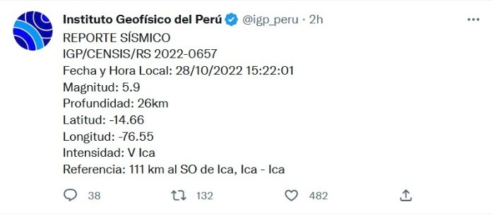 Al menos nueve sismos, con magnitudes entre 4 y 5.9 en la escala de Richter, se sintieron en lo que va de este viernes en la región de Ica, en la costa central de Perú, sin que hasta el momento se reporten daños personales o materiales, informaron fuentes oficiales.El Instituto Geofísico del Perú (IGP) señaló que el último temblor de tierra se presentó a las 15:22 horas y alcanzó una magnitud de 5.9, con epicentro a 111 kilómetros al suroeste de Ica. Este sismo tuvo una profundidad de 26 kilómetros."Durante el día, otros ocho movimientos ocurrieron en la misma jurisdicción, con magnitudes de entre 4 y 5.1, y profundidades de 19 kilómetros en promedio", reportó el Centro de Operaciones de Emergencia Nacional (COEN).Agregó que las autoridades locales "iniciaron el monitoreo en las zonas vulnerables sin reportar, hasta el momento, daños estructurales ni a la población".El primero de estos movimientos se registró a las 04:11 horas del viernes, con una magnitud de 5.1 y epicentro a 91 kilómetros al sur oeste de Ica, y el segundo a las 4:16 horas, con una magnitud de 4.6 y epicentro a 94 kilómetros al sur oeste de la misma localidad.El tercer temblor se reportó a las 05:56 horas, con una magnitud de 4.5 y epicentro a 99 kilómetros al sur oeste de Ica, y el cuarto a las 7:19 de la mañana, con una magnitud de 4.1 y epicentro a 90 kilómetros al sur oeste de Ica.El IGP reportó el siguiente sismo a las 9:21 horas, con una magnitud de 5 y epicentro a 107 kilómetros al suroeste de Ica, y otro más a las 13:52 horas con magnitud 4 y epicentro a 81 kilómetros al suroeste de Ica.Además, a las 14:16 horas se sintió otro movimiento de magnitud 4.4, con epicentro a 103 kilómetros al suroeste de Ica, y luego otro a las 14:19 horas con magnitud 4.9 y epicentro a 91 kilómetros al suroeste de Ica.Los sismos fueron percibidos con una intensidad entre leve y moderada por los habitantes de Ica y ninguno de ellos generó alerta de tsunami en el litoral peruano, según precisó la Dirección de Hidrografía y Navegación de la Marina de Guerra del Perú.JM