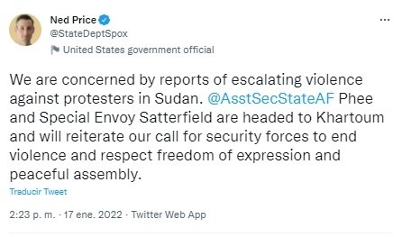 Este lunes, siete manifestantes fueron asesinados en Sudán, las víctimas estaban protestando contra el golpe de Estado del general Abdel Fatah al Burhan, esta protesta es una de las más sangrientas ocurridas desde octubre.Miles de sudaneses volvieron a las calles desafiando a las patrullas policiales y a los militares equipados con armamento pesado.Según fuentes médicas, los manifestantes fueron reprimidos con granadas lacrimógenas, aturdidoras, con cañones de agua y con balas reales, los disparos fueron la razón de que 7 manifestantes perdieran la vida.La diplomacia estadounidense anunció que dos emisarios están en camino a Jartum para solicitar a las fuerzas de seguridad sudanesas que se ponga “fin a la violencia” en contra de los manifestantes."Estamos preocupados por las informaciones de una escalada de violencia contra los manifestantes en Sudán", tuiteó el portavoz del Departamento de Estado, Ned Price.Desde el golpe de Estado del pasado 25 de octubre, son 71 manifestantes los que han muerto.La policía, por su parte dio a conocer que el jueves de la semana pasada uno de sus generales fue apuñalado por uno de los manifestantes , y lamentablemente perdió la vida, el cuerpo armado advirtió que serán juzgados conforme las leyes de excepción que rigen en el país desde que se decretó el estado de emergencia tras el golpe de Estado.En Jartum la violencia se prolongó hasta la tarde de este lunes, y llegó a las inmediaciones del palacio presidencial, el antiguo cuartel general del dictador Omar al Bashir que dimitió de su cargo en 2019 a causa de la presión de los manifestantes en las calles.En la actualidad, el palacio es la sede de las autoridades de transición, en manos del general Burhan.DO
