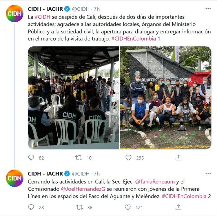La Comisión Interamericana de Derechos Humanos (CIDH) finalizó este jueves su visita oficial a Colombia en la que revisó numerosas denuncias sobre la violencia policial y civil que durante las protestas contra el Gobierno ha dejado decenas de muertos y desaparecidos, así como miles de heridos.En su última jornada la presidenta de la CIDH, Antonia Urrejola, visitó la exposición "Vidas Robadas" que agrupa en el espacio "Fragmentos, Espacio de Arte y Memoria" de Bogotá los rostros y las historias de personas asesinadas en manifestaciones sociales ocurridas en el país desde 2019.En ese espacio, que hasta el 27 de junio albergará la memoria de las víctimas, la comisionada escuchó los relatos y el clamor de justicia de algunos padres que comenzaron una intensa lucha para que la muerte de sus hijos, la mayoría de ellos jóvenes asesinados supuestamente por agentes de la Policía, no quede en la impunidad.La delegación de la CIDH también se reunió en Bogotá con la vicepresidenta y canciller, Marta Lucía Ramírez, y con la alcaldesa de la capital, Claudia López, y concluyó su paso por la ciudad de Cali, epicentro de las manifestaciones y donde se han presentado los hechos más graves de violencia."La CIDH se despide de Cali, después de dos días de importantes actividades; agradece a las autoridades locales, órganos del Ministerio Público y a la sociedad civil la apertura para dialogar y entregar información en el marco de la visita de trabajo", informó la Comisión.La delegación de la CIDH revisó en el país las acusaciones que recaen sobre la Policía por el desproporcionado e indiscriminado uso de armas de fuego durante las manifestaciones, escuchó cientos de testimonios de víctimas de violencia, recibió informes sobre casos de desapariciones y violencia de género, así como los ataques contra la prensa y la misión médica.La alcaldesa de Bogotá, quien entregó hoy un informe sobre las violaciones de derechos humanos en las protestas, "pidió a la CIDH apoyo para lograr con celeridad la investigación, judicialización y reparación a las que haya lugar dentro de estas denuncias de civiles y de miembros de la fuerza pública afectados".Entre sus solicitudes la mandataria local también reiteró la necesidad de definir una reforma integral a la Policía, así como un pacto social y económico a largo plazo que sea construido con todos los actores de la sociedad.JM