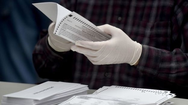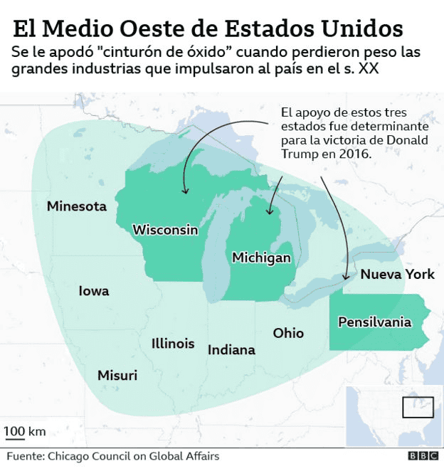 En una noche más ajustada de lo esperado, Estados Unidos cerró la jornada de sus elecciones más tensas en décadas sin un resultado claro y el veredicto final podría demorar días o incluso semanas en conocerse.Todo porque todavía hay nueve estados en los que no se ha proyectado un claro ganador: Alaska, Arizona, Carolina del Norte, Georgia, Maine, Michigan, Nevada, Pensilvania y Wisconsin."Donald Trump ya cantó victoria y acusó a sus opositores de estar preparando un fraude electoral. Sin embargo, ese todavía no es el caso", destaca el corresponsal de la BBC en EE.UU. Anthony Zurcher."Todavía hay millones de votos emitidos legalmente en proceso de recuento", recuerda.Efectivamente, las condiciones particulares de estos comicios -celebrados en medio de una pandemia y con un número récord de votos por correo- retrasaron el conteo en varios estados.Y estos retrasos, que eran esperados, se suman a otros que resultan de la diferencia horaria y una contienda cerrada en la que cada voto cuenta.Pero ¿qué necesitan entonces Joe Biden o Donald Trump para hacerse con la presidencia?Las encuestas previas a los comicios sugerían resultados que iban desde una cómoda victoria de Biden a una estrecha victoria de Trump, pero un triunfo claro ya está completamente descartado."Cualquier victoria será estrecha. Es solo una cuestión de quién, cómo y cuánto tiempo falta para que lo sepamos", asegura Zurcher."Y todo dependerá de un puñado de estados: Arizona, Georgia, Wisconsin, Michigan y Pensilvania", agrega.Como explica Zurcher, por el momento Arizona parece estarse inclinando hacia Biden, quien también marcha a la cabeza en Nevada.Y eso significa que el demócrata tendría que ganar dos de los tres estados del llamado "cinturón de óxido"que todavía están por definirse -Wisconsin, Michigan y Pensilvania- para asegurar la victoria.Pero también podría reemplazar uno de ellos por Georgia o Carolina del Norte.De no conseguirlo, la victoria sería casi definitivamente para Trump.Pero ¿cuáles son las probabilidades de ambos candidatos?A continuación hacemos un repaso a la actual situación en los estados en los que aún no se proyectó ganador y su posible impacto en el resultado final.Todo indica que tres territorios del que fuera el corazón de la industria estadounidense en el siglo XX, de glorioso pasado e incierto futuro, volverá a definir las elecciones presidenciales.Wisconsin, Michigan y Pensilvania (con 10, 16 y 20 votos electorales) abrieron las puertas de la Casa Blanca a Donald Trump hace cuatro años, por tan solo unos 80.000 votos en conjunto y menos de 1% de ventaja en cada uno; y todo apunta a que la reelección del mandatario quedará también en sus manos.Como ya explicamos, si Biden confirma su ventaja en Arizona y Nevada solamente necesita triunfar en dos de estos tres estados para llegar a la presidencia.Y aunque por el momento solamente le lleva ventaja a Trump en uno -Wisconsin- se da por sentado que la mayoría de votos por contar en Michigan y Pensilvania también favorecerán al candidato demócrata, tal vez lo suficiente como para darle la victoria definitiva.El escrutinio de los votos en estos tres estados, sin embargo, se podría alargar mucho.Algunos estados empezaron a contabilizar el voto por correo y anticipado antes del día de las elecciones, agilizando el proceso, pero en Wisconsin, Michigan y Pensilvania las autoridades no permitieron iniciar el escrutinio hasta la mañana de la jornada electoral o después del cierre de urnas."Duerman un poco. Tuvimos un día electoral exento de problemas. Los votos se han emitido. Sus autoridades locales electorales están trabajando para contar los votos. Como llevamos diciendo meses: estas elecciones se terminarán cuando todos los votos admisibles sean contabilizados. Calma", escribió el fiscal general de Pensilvania, Josh Shapiro, en Twitter, hacia la medianoche."Todavía tenemos más de un millón de boletas por correo para contar en Pensilvania. Les prometí a los residentes de Pensilvania que contaríamos cada voto y eso es lo que vamos a hacer", tuiteó el gobernador del estado, Tom Wolf, en horas de la madrugada.Por si eso fuera poco, Pensilvania también acepta votos que lleguen por correo hasta el 12 de noviembre -siempre que hayan sido sellados antes de o en el mismo día 3-, por lo que si la carrera sigue ajustada, habrá que esperar días para conocer el resultado final.Michigan, por su parte, advirtió explícitamente que finalizar el escrutinio podría tomarle hasta el viernes, aunque Bloomberg informó que los resultados finales llegaría este miércoles por la tarde.Arizona es otro de los estados en los que aún no se proyectó ganador, y que puede inclinar la balanza, con 11 votos electorales.El bastión republicano, que desde 1952 solo votó una vez por un candidato demócrata (Bill Clinton, en 1996), pasó a estar en disputa estas elecciones, y tanto AP como Fox News ya lo declararon a favor de Biden.Pasada la medianoche, sin embargo, el gobernador de Arizona, Doug Ducey, señaló en Twitter que todavía era "muy pronto" para declarar ganador en el estado."No se han reportado la totalidad de los votos del día de las elecciones, y ni siquiera hemos empezado a contabilizar los votos anticipados que se dejaron en los centros electorales", explicó."Contemos los votos —todos los votos— antes de hacer anuncios", pidió.En la noche de las elecciones, otros estados cruciales también sufrieron retrasos y se espera que sigan contabilizando, aunque su conteo de votos está más avanzado.Uno de ellos es Georgia, bastión republicano desde 1972, y que por un problema técnico decidió que retomaría el conteo el miércoles, cuando el escrutinio estaba al 87% y le daba una ventaja a Trump del 5,3%.El presidente ganó Georgia en 2016 por 5,1% y los cambios demográficos que ha experimentado, con una sociedad más diversa, le llevó este año a ser considerado "estado péndulo".Otro de los terr
