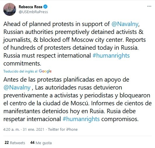 Más de mil 500 personas han sido detenidas este domingo en las protestas que tienen lugar en toda Rusia en apoyo del líder opositor Alexéi Navalni, en prisión preventiva tras su regreso de Alemania, donde se recuperaba del envenenamiento que sufrió el año pasado.Según el portal OVD-info, especializado en el seguimiento de arrestos, en las manifestaciones pacíficas, que se celebran en 142 ciudades del país, las fuerzas de seguridad rusas han detenido hasta el momento a mil 502 personas, de los cuales la mayoría, 307, se han producido en Moscú.Entre los detenidos se encuentra la esposa de Navalni, Yulia Navalnaya, de acuerdo con el canal de televisión independiente Dozhd y la agencia estatal TASS, que indica, citando a su abogada, que fue arrestada cuando marchaba junto a otros manifestantes hacia la prisión de Matrósskaya Tishiná, donde está encarcelado su marido.Navalnaya ya fue detenida en las protestas del pasado día 23, en las que fueron arrestadas más de cuatro mil personas.En la capital rusa, donde la protesta comenzó a las 03:00 horas tiempo de México, las detenciones comenzaron incluso antes del inicio de la marcha, convocada inicialmente en la plaza de Lubianka, donde se encuentra la sede del Servicio Federal de Seguridad (FSB, antiguo KGB).El fuerte dispositivo de seguridad y el cierre de las estaciones de metro más cercanas, impidió a los manifestantes llegar a Lubianka, por lo que el equipo de Navalni anunció un cambio de la ruta para establecer los puntos de reunión en las paradas de Sújarveskaya y Krasnye Vorota.Allí, la policía ya esperaba a los manifestantes a las salidas del metro y procedió a detener masivamente a todo aquel que se acercaban al lugar de encuentro.Desde allí una columna de miles de manifestantes procedió al Anillo de los Bulevares y a la plaza Komsomolskaya, conocida como la de los tres ferrocarriles, donde agentes antidisturbios formaron varios cordones humanos para impedir el acceso.Antes de que la plaza fuera despejada los allí congregados gritaban "libertad para Alexéi Navalni".Al menos un hombre resultó herido por el uso de la fuerza de la policía y tuvo que ser vendado en la frente.Los manifestantes marchan actualmente hacia la prisión de Matrósskaya Tishiná, gritando "Uno para todos y todos para uno. Suéltalo, Libertad" en referencia al encarcelado opositor.Las detenciones fueron especialmente violentas en San Petersburgo, donde las fuerzas del orden impidieron el acceso a la céntrica Avenida Nevski y donde finalmente los ciudadanos -varios miles- se congregaron en una plaza cerca del Teatro de Juventud.Posteriormente marcharon hacia la plaza Sennaya, donde la policía recurrió a gas pimienta y descargas eléctricas contra algunos de ellos, además de pegar con porras a los manifestantes y a varios periodistas, según el portal independiente Meduza.Asimismo, varios ciudadanos se dirigían hacia la Asamblea Legislativa, donde también se produjeron inmediatamente detenciones.La portavoz de la embajada de EU en Rusia, Rebecca Ross, condenó en un mensaje de su cuenta de Twitter el comportamiento de las fuerzas de seguridad contra manifestantes pacíficos y periodistas que portan chalecos que les identifica como tales."Rusia debe respetar los compromisos internacionales sobre los derechos humanos", escribió.GC