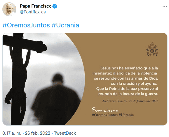 El Papa Francisco pidió hoy paz para que el mundo sea protegido "de la locura de la guerra" en un mensaje publicado en las redes sociales en varios idiomas, entre ellos en ruso y en ucraniano, y que acompañó con las palabras "recemos juntos" y "Ucrania"."Jesús nos enseñó que a la diabólica insensatez de la violencia se responde con las armas de Dios, con la oración y el ayuno. La reina de la paz preserva al mundo de la locura de la guerra", escribió Francisco en las redes sociales, en varios idiomas, entre ellos ucraniano, ruso, italiano, inglés y español.El viernes, publicó otro con la frase "la guerra es un fracaso de la política y de la humanidad, una rendición vergonzosa".También el viernes por la mañana el Papa Francisco acudió personalmente a la embajada rusa ante la Santa Sede para ver al embajador, Alexander Avdeev, y expresarle su preocupación por el ataque de Rusia a Ucrania, confirmó la oficina de comunicación del Vaticano.Por la tarde, mantuvo una conversación telefónica con el jefe de la Iglesia greco-católica ucraniana, Sviatoslav Shevchuk, a quién garantizó que hará "todo lo que pueda", según dijo la Iglesia greco-católica ucraniana en Roma en un comunicado.OA
