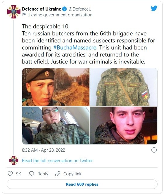 Los llamó "los 10 despreciables", los "carniceros de Bucha". El Ministerio de Defensa de Ucrania difundió este jueves en Twitter las fotos de 10 hombres que identificó como soldados rusos de la brigada 64 que habrían cometido "crímenes de guerra" en la localidad de Bucha, en Ucrania."Diez carniceros rusos de la brigada 64 han sido identificados y nombrados sospechosos de cometer la #MasacreDeBucha. Esta unidad había sido premiada por sus atrocidades, y volvió al campo de batalla. La justicia para los criminales de guerra es inevitable", señaló el ministerio en su cuenta de Twitter.Imágenes de decenas de cuerpos vestidos de civil en las calles, algunos de ellos con las manos atadas a la espalda y señales de ejecución aparecieron en Bucha y otras localidades alrededor de la capital ucraniana, e impactaron al mundo. En total, se localizaron más de 400 cuerpos mutilados, torturados y asesinados en la zona.A principios de abril fue identificado el teniente coronel Omurbekov Azatbek Asanbekovich como el presunto responsable de la invasión a Bucha y denominado "el carnicero". Sin embargo, de acuerdo con medios como The Daily Mail, Azatbek fue promovido a coronel la semana pasada.Ahora, el ministerio identifica a otros efectivos rusos, como el cabo Andrei Biszyaev, de 33 años, quien llevaría más de 10 años en el Ejército ruso; o el soldado Sergei Peskarev, de 24 años, quien ha subido a Facebook fotos que prueban que pertenece a la brigada 64. También es identificado el sargento Nikita Akimov, a quien se acusa de secuestrar y torturar a residentes de Bucha.Se cree que los soldados identificados, todos de entre 24 a 33 años, están luchando en el Donbás.De acuerdo con la fiscal, desde el inicio de la invasión, el 24 de febrero, se han identificado cinco mil 600 presuntos crímenes de guerra por parte de Rusia.Ante los crecientes violaciones de niñas y mujeres ucranianas por parte de las fuerzas rusas, activistas están optando por enviar miles de anticonceptivos con el fin de evitar embarazos no deseados.El diario británico The Guardian reportó este jueves que la Federación Internacional de Planificación Familiar (IPPF) ha enviado a Ucrania unos dos mil 880 paquetes de pastillas conocidas como "píldora del día después", mientras que una red de voluntarios de toda Europa ha estado recogiendo donaciones de la medicación en el extranjero y entregándolas en los hospitales."El plazo para tratar a las víctimas de la violencia sexual es realmente esencial", dijo Julie Taft, de la IPPF. "Si se atiende a una mujer en los cinco días siguientes al suceso, se le debe dar automáticamente esa medicación", señaló.Taft explicó a The Guardian que la IPPF también estaba enviando píldoras abortivas médicas, que pueden utilizarse hasta las 24 semanas de embarazo.Aunque la anticoncepción de emergencia estaba ampliamente disponible en Ucrania, la invasión que Rusia inició el 24 de febrero ha destruido las cadenas de suministro locales, ha provocado un desplazamiento de pacientes y proveedores de atención sanitaria, y ha aumentado el índice de agresiones sexuales.JM