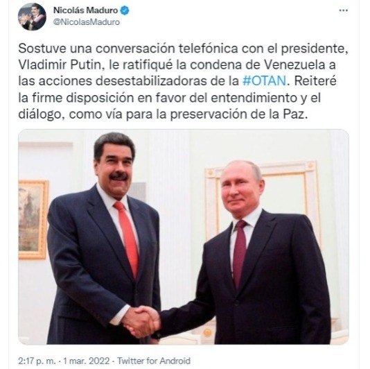 Nicolás Maduro, presidente de Venezuela, llamó hoy a su homólogo de Rusia, Vladímir Putin, para ratificarle su "firme apoyo" y su condena a las acciones "desestabilizadoras" de la OTAN y de Estados Unidos.En un mensaje publicado en su cuenta de Twitter, Maduro afirmó: "Sostuve una conversación telefónica con el presidente, Vladímir Putin, le ratifiqué la condena de Venezuela a las acciones desestabilizadoras de la OTAN. Reiteré la firme disposición en favor del entendimiento y el diálogo, como vía para la preservación de la Paz".Anteriormente, la Embajada rusa en Venezuela dio a conocer detalles de la conversación entre los mandatarios a través de una publicación en Facebook."Por iniciativa venezolana, los presidentes Vladímir Putin y Nicolás Maduro mantuvieron una conversación telefónica (...) Maduro expresó su firme apoyo a Rusia, condenó las actividades desestabilizadoras de EU y la OTAN y subrayó la importancia de contrarrestar la campaña de mentiras y desinformación desatada por los países occidentales", escribió la delegación diplomática.El canciller venezolano, Félix Plasencia, detalló que Putin compartió con Maduro "sus valoraciones sobre los acontecimientos en torno a Ucrania" y destacó que el objetivo de la "operación militar especial" es la "protección de los civiles en Donbás".Además, la Embajada indicó que Putin explicó a Maduro que entre los objetivos de la operación militar también está "el reconocimiento por parte de Kiev de la República de Donetsk y República de Luhansk, así como la soberanía rusa sobre Crimea, la desmilitarización y desnazificación del Estado ucraniano, garantizando su estatus neutral y no nuclear".Los líderes de ambos países discutieron temas relacionados con el desarrollo de "la alianza estratégica ruso-venezolana y los avances en la ejecución de proyectos conjuntos".Añadieron que "se acordó continuar con el intercambio de delegaciones y contactos a varios niveles".Por su parte, el embajador de Rusia en Venezuela, Sergey Mélik, agradeció el apoyo de Venezuela, tras la llamada. "Agradecemos el apoyo de la hermana Venezuela. ¡Venceremos!", escribió el funcionario ruso en redes sociales.Rusia lanzó hace seis días una operación militar en Ucrania que ha dejado más de un centenar de muertos, según la ONU, aunque las autoridades ucranianas elevan a más de 350 la cifra de fallecidos.Entretanto, el pasado jueves, el Gobierno de Venezuela hizo un llamado "a retomar el camino del entendimiento diplomático" ante la crisis generada en Ucrania tras la operación militar."Venezuela hace un llamado a retomar el camino del entendimiento diplomático mediante el diálogo efectivo entre las partes involucradas en el conflicto para evitar un escalamiento", dijo el Ejecutivo en un comunicado difundido por el presidente Maduro.
