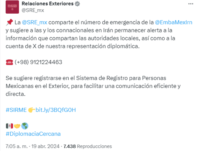 La tensión entre Irán e Israel ha ido en aumento en los últimos días ante las constantes amenazas de bombardeos entre ambas naciones, manteniendo en suspenso a todo el mundo por lo delicado de la situación. Ante la constante amenaza de una escalada de violencia, los mexicanos que se encuentran en el país persa han pedido ayuda a la SRE para regresar a México, puesto que en la guerra nadie está a salvo. La Secretaría de Relaciones Exteriores (SRE) ha respondido al llamado, y manifestó su disposición de ayudar a los connacionales en Irán. Mediante la red social X (antes Twitter) el organismo publicó el número de emergencia al que los mexicanos en Irán pueden llamar y asesorarse.Dicho número es (+98) 9121224463, y ahí se ofrecerá ayuda sin coste para sortear esta delicada situación. La Secretaría también recomendó estar pendientes de las disposiciones del gobierno iraní, así como de lo que se publique en la cuenta de X oficial de la SRE.***Mantente al día con las noticias, únete a nuestro canal oficial de WhatsAppFA