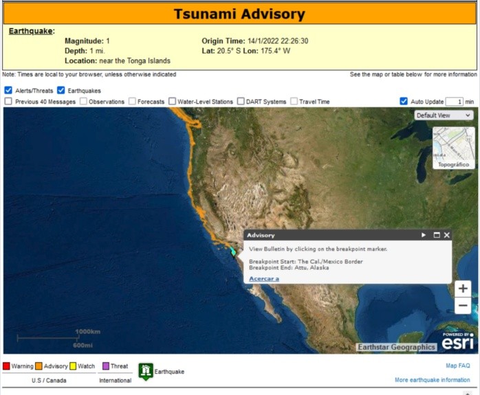 Tonga, un país insular del océano Pacífico, emitió hoy sábado una alerta de tsunami tras la erupción de un volcán submarino. El US Tsunami Warning Center también lanzó un aviso para varias costas del Pacífico norte, en las que se incluyen las costas de la Península de Baja California, México; este indica que se prevén variaciones mínimas en el nivel del mar y posibles alteraciones en corrientes cerca del borde costero.En redes sociales circulan videos que muestran un gran oleaje en las zonas costeras de Tonga.La alerta de tsunami afectaba a todo el país oceánico, señalaron los Servicios Meteorológicos de Tonga. En la cercana Fiyi, las autoridades pidieron a la población que evite acercarse a la costa por las fuertes corrientes y las peligrosas olas.La web Islands Business reportó que un convoy de efectivos de la policía y del ejército evacuaron al rey de Tonga, Tupou VI, de su palacio, próximo a la costa. El monarca fue uno de los muchos residentes que se fueron a tierras más altas.La del sábado fue la última de una serie de erupciones espectaculares del volcán Hunga Tonga-Hunga Ha'apai.En Twitter, un usuario identificado como Dr. Faka'iloatonga Taumoefolau publicó un video en el que se veían las olas estrellándose en la orilla."Puedo escuchar literalmente la erupción del volcán, suena bastante violenta", escribió en la plataforma. En otra publicación dijo: "Llueven ceniza y pequeñas piedras, la oscuridad cubre el cielo".Antes, el portal de noticias Matangi Tonga reportó que los científicos habían observado explosiones masivas, truenos y relámpagos cerca del volcán luego del inicio de la erupción ayer viernes.Las imágenes satelitales mostraron una nube de ceniza, vapor y gas de cinco kilómetros de ancho que se elevaba en el aire hasta unos 20 kms, agregó la página web.A más de dos mil 300 kms de distancia, las autoridades de Nueva Zelanda alertaron de posibles marejadas ciclónicas por la erupción.La Agencia Nacional de Gestión de Emergencias explicó que algunas partes de Nueva Zelanda podrían registrar "corrientes fuertes e inusuales y marejadas impredecibles en la costa luego de una gran erupción volcánica".Por otra parte, el Centro de Alerta de Tsunamis del Pacífico dijo hoy sábado en la noche que la amenaza a la Samoa Americana parecía haber pasado, aunque las pequeñas fluctuaciones en el mar podrían continuar.OF