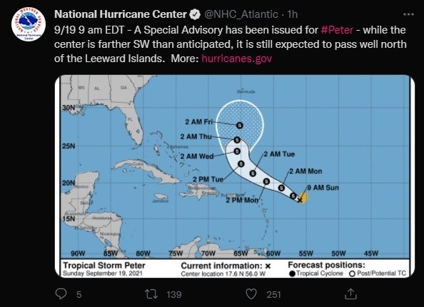 La tormenta tropical “Peter” se formó a primeras horas de este domingo cerca de las Antillas Menores mientras que en el extremo este de la cuenca atlántica apareció, también hoy, la décimo séptima depresión tropical de este año.Con vientos máximos sostenidos de 75 km/h, “Peter” se desplaza 24 km/h rumbo al oeste-noroeste, y en su ruta prevista no supone riesgo directo para zonas costeras."En la trayectoria pronosticada, se espera que Peter pase bien al norte de las Islas de Sotavento el lunes y martes", señaló en un boletín el Centro Nacional de Huracanes (NHC, en inglés) de EU.El centro meteorológico, con sede en Miami, Florida, sugirió a Puerto Rico, las Islas Vírgenes y a las Islas de Sotavento (Guadalupe, Antigua y Barbuda) vigilar el desarrollo de esta tormenta.“Peter” puede producir desde este domingo hasta unas tres pulgadas (76 milímetros) de lluvia en Puerto Rico, las Islas Vírgenes y partes del norte de las Islas de Sotavento, donde también se puede registrar un fuerte oleaje.Ubicada a 470 millas (755 km.) al este de las Islas de Sotavento, Peter podría empezar a debilitarse entre el lunes y martes, de acuerdo al NHC, que revela que los vientos con fuerza de tormenta tropical se extienden hasta unas 105 millas (170 km.) desde el centro del ciclón.Por otro lado, el NHC dio cuenta de la formación de la 17 depresión tropical de la actual temporada en el Atlántico, a unas 530 km al suroeste del extremo sur de las islas de Cabo Verde, en el oeste de África.La depresión, que no ha merecido la emisión de alertas o avisos para zonas costeras, presenta vientos máximos sostenidos de 55 km/h y se desplaza con dirección nor-noroeste a 14 22 km/h.La depresión podría fortalecerse y transformarse en una tormenta tropical entre hoy y el lunes, para luego empezar a debilitarse de forma gradual a partir del martes y en medio del Atlántico, según el NHC.En lo que va de este año se han formado seis huracanes en la cuenca atlántica, “Elsa”, “Grace”, “Henri”, “Ida”, “Larry” y “Nicholas”, de los cuales “Grace”, “Ida” y “Larry” alcanzaron la categoría mayor a 3.El último de ellos, “Nicholas”, tocó tierra esta semana en el este de la península de Matagorda, en Texas, pero rápidamente se debilitó a tormenta tropical no sin descargar fuertes lluvias en ese estado, Luisiana y otras partes del sureste de EU.AC