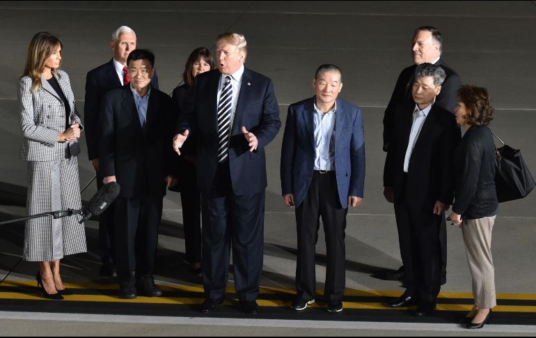 El presidente de EU, Donald Trump, agradeció hoy al líder norcoreano, Kim Jong-un, la liberación de tres estadounidenses presos en Corea del Norte.Trump recibió hoy de madrugada a los tres estadounidenses a su llegada a la base aérea Andrews, a las afueras de Washington.El presidente y la primera dama, Melania Trump, dieron la bienvenida a los liberados a bordo del mismo avión en el que llegaron.Minutos después, Trump se dirigió a los periodistas en la pista de aterrizaje para dar las gracias a Kim Jong-un por la liberación de los presos.Junto a Trump, los tres liberados dieron muestras de su alegría sonriendo y alzando los brazos."Creo que esto será un gran éxito. Nunca se ha llegado tan lejos con Corea del Norte, no ha habido una relación como esta", dijo Trump al referirse a la histórica reunión que mantendrá con Kim Jong-un en los próximos días."Realmente creo que (Kim Jong-un) quiere hacer algo y traer a su país al mundo real", añadió el presidente, que todavía no quiso revelar el lugar ni la fecha de la cumbre con el líder norcoreano, aunque algunas informaciones ya apuntan a que será en Singapur.Uno de los liberados, Kim Dong-chul, dijo que estar en EU "es como un sueño", de acuerdo a la traducción de la intérprete que los acompañó en el recibimiento.Preguntado por el trato recibido durante su detención, Kim Dong-chul aseguró que había realizado trabajos forzosos, pero también que había recibido tratamiento médico.Tras ese recibimiento, los liberados fueron trasladados al Centro Médico Militar Nacional Walter Reed, también cercano a Washington, aunque las autoridades estadounidenses reconocieron que parecían "en buen estado de salud".Los liberados son Kim Dong-chul (64 años), Kim Sang-duk (58) y Kim Hak-song (ronda los 60), todos de origen surcoreano y nacionalizados posteriormente estadounidenses.Kim Dong-chul, detenido en 2015, estaba condenado a diez años de cárcel por espionaje, mientras que los otros dos fueron arrestados hace un año y estaban acusados de "actos hostiles" contra el régimen norcoreano.