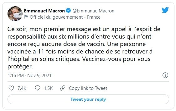 El presidente francés Emmanuel Macron llamó el martes a las personas elegibles a que acudan a recibir su dosis de refuerzo contra el COVID-19 para combatir un aumento de las infecciones que está generando preocupación en toda Europa.Todas las personas mayores de 65 años que fueron vacunadas hace más de seis meses necesitarán una dosis de refuerzo para mediados de diciembre para que su "pase de salud" siga válido, dijo Macron.El presidente prometió incrementar la implementación del pase de salud, que es requerido para ingresar a todos los restaurantes y muchas instalaciones públicas en el país. Para recibirlo, las personas deben mostrar prueba de vacunación contra el COVID-19, un resultado negativo en una prueba diagnóstica o evidencia de haberse recuperado recientemente del virus.Las dosis de refuerzo, actualmente autorizadas en Francia para todas las personas mayores de 65 o con padecimientos subyacentes, serán expandidas en diciembre para incluir a aquellos de 50 años o mayores, manifestó."Cada uno de nosotros debe hacer su parte" para evitar una fatal "quinta ola" de la pandemia, declaró Macron en un discurso televisado.Tras resaltar que la mayoría de los hospitalizados en Francia por el virus no estaban vacunados, Macron llamó además a los seis millones de no vacunados a que "se vacunen. Protéjanse".Casi 75% de la población francesa está plenamente vacunada, incluyendo 88% de los adultos. Es una de las tasas más elevadas en Europa, pero las vacunaciones se han estancado en semanas recientes.Los casos del coronavirus han estado subiendo de nuevo en muchos países europeos, y algunos hospitales se ven otra vez bajo fuerte presión, al bajar las vacunaciones y acercarse el invierno.JM