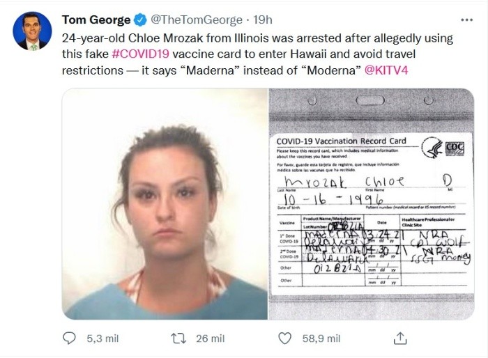Una mujer originaria de Illinois presentó una tarjeta de vacunación contra COVID-19 falsa para poder viajar a Hawai, y fue descubierta por un error ortográfico en la palabra Moderna, la cual estaba escrita como "Maderna", según documentos de la corte.En un intento por evitar el requerimiento de 10 días de cuarentena para los visitantes a Hawai, la mujer de 24 años envió su certificado de vacunación al programa de traslado seguro del estado y llegó el 23 de agosto a Honolulu a bordo de un vuelo de Southwest Airlines, según los documentos."Inspectores del aeropuerto encontraron errores sospechosos... por ejemplo, que Moderna estaba mal escrito y que su lugar de residencia era Illinois pero se vacunó en Delaware", dijo Wilson Lau, agente especial de la división de la Fiscalía estatal, en un email dirigido a un funcionario de Delaware que confirmó que no había un registro de vacunación para una mujer con ese nombre y fecha de nacimiento.El correo electrónico es parte de los documentos presentados ante la Corte. Fue acusada de dos delitos menores por violar las normativas de emergencia de Hawai para controlar la propagación de COVID-19. La mujer había estado detenida y se le había fijado una fianza de dos mil dólares hasta que un juez ordenó su liberación durante una audiencia el miércoles. Programó una nueva audiencia en tres semanas.El defensor público estatal James Tabe, cuya oficina representó a la acusada en la audiencia de esta semana, se negó a comentar respecto al caso, destacando que no está claro si contratará a un abogado privado o solicitará a un defensor de oficio.Si te interesó esta noticia y quieres saber más, entonces descarga y descubre INFORMAPlus, la aplicación digital de EL INFORMADOR, en donde tenemos contenidos exclusivos, seleccionados por nuestros editores, para darles una experiencia más completa a los lectores. Si eres suscriptor de EL INFORMADOR tu acceso está incluido, solicítalo al 33 3678-7777Descarga la aplicación y pruébala GRATIS por treinta días.Para iOS: https://apple.co/35jaVgbPara Android: https://bit.ly/3gwVSEVJM