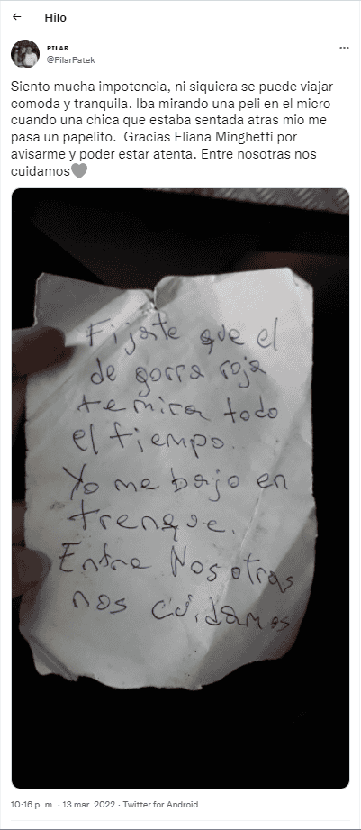 Un potencial caso de acoso sexual se evitó gracias al apoyo que una pasajera brindó a una mujer a bordo de una unidad del transporte público en la comunidad de América, en Buenos Aires (Argentina), quien notó que un hombre le miraba con insistencia y encontró la manera de hacérselo saber; su mensaje se ha vuelto viral.Pilar Patek compartió en Twitter una fotografía en la que se aprecia la manera en que fue alertada de que un hombre a bordo de la misma unidad no dejaba de mirarla. La imagen muestra una nota escrita a mano en la que una joven llamada Elina le hizo saber de manera segura la situación."Fíjate que el de gorra roja te mira todo el tiempo. Yo me bajo en Trenque", se leía en la nota que Pilar había recibido en su mano por parte de Elina, quien iba sentada detrás suyo en el autobús. “Entre nosotras nos cuidamos”, concluye en el tuit publicado la noche del 13 de marzo pasado.Pilar asegura en su publicación haber sentido impotencia ante la situación: "Siento mucha impotencia, ni siquiera se puede viajar cómoda y tranquila. Iba mirando una peli en el micro cuando una chica que estaba sentada atrás mío me pasa un papelito", comparte. Patek además agradece el gesto que tuvo la otra pasajera: "Gracias Elina Minghetti por avisarme y poder estar atenta. Entre nosotras nos cuidamos".A su publicación los internautas se sumaron, algunos aplaudiendo que se haya evitado un caso de acoso sexual por dicho gesto, otros cuestionando la “casualidad” con que ambas pasajeras terminaron “intercambiando cuentas de Twitter” y la autenticidad del caso.No obstante, diversas mujeres respondieron a los comentarios que algunos usuarios estaban dejando mostrando cierta empatía por el hombre, lamentando que este tipo de situaciones sigan siendo tan comunes y que sigan considerándose ellos las víctimas."Me encanta q todos los tipos asumen q la piba estaba sugiriendo q se bajara en la misma parada q ella y las mujeres entendimos q solo era un ''a partir de ese punto no te puedo cuidar más así q prestá atención''", apuntó la usuaria Milipili peronista. "Impresionante como salieron todos ofendidos porque empatizaron con el ACOSADOR. Alucino. Hay que cuidarse chicas! Me alegra mucho que Elina haya estado ahí y se diera cuenta de lo que estaba pasando o de lo que podía pasar. Mejor prevenir siempre", señala lizzie mcguire.La publicación de Pilar acumula más de 5 mil ‘Retuits’ y más de 102 mil ‘Me gusta’ en la red social.