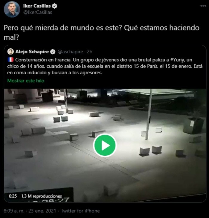 Un adolescente de 15 años fue agredido brutalmente a la salida de su escuela en París. Desde entonces, su familia ha buscado reunir información que llegue a la detención de los atacantes, quienes lo dieron por muerto el pasado 15 de enero.Yuriy celebró su cumpleaños número 15 internado en un hospital, indica el diario Midi libre, de Montpellier. El adolescente fue golpeado por una docena de sujetos a la salida de su escuela, localizada en el distrito 15 de París, Francia. Según una prima del joven, ''Yuriy estaba con unos amigos después de la escuela, entre las cinco y las seis de la tarde, cuando llegaron un grupo de personas, aparentemente de Vanves (...) Cuando mi primo trató de correr, se cayó al suelo y allí lo golpearon. Realmente no creo que Yuriy estuviera involucrado de ninguna manera en este tipo de cosas'', indica, señalando que podría haberse tratado de un asunto de pandillas rivales.Los servicios de emergencia llegaron rápidamente al lugar donde se registró la agresión y lo trasladaron al hospital Necker, donde fue inducido a un coma. Su madre Nataliya, le confió al sitio Actu.fr que aún se encuentra en estado de shock: ''Cuando lo vi en el camión de bomberos, su cráneo estaba abierto en varios lugares, fue realmente horrible. Fue agredido con barras de hierro y muletas. Me dijo que no conocía a los individuos, que tenía dolor, que tenía frío y que no quería morir''. Además, indicó que ya presentó una denuncia y alertó a la embajada de Ucrania de donde ella es originaria.El pasado 15 de enero se abrió una investigación por ''intento de homicidio'', y mediante imágenes que fueron capturadas por cámaras instaladas en el lugar, la familia de Yuriy hace un llamado a través de las redes sociales para recolectar testimonios que los lleven a dar con los responsables. Además, la madre creó una cuenta en Instagram donde busca recopilar cualquier información.El video de la agresión ha llamado la atención de diferentes personalidades, entre las que se encuentran el futbolista del Barcelona Antoine Griezmann, y el ex portero del Real Madrid, Iker Casillas.OF