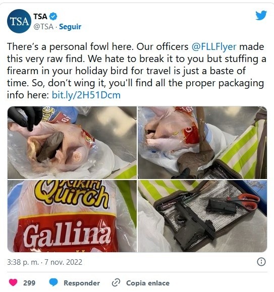 Autoridades de Estados Unidos revelaron el hallazgo de un arma oculta al interior de un pollo crudo que estaba envuelto en una bolsa de plástico. La mujer que llevaba la pistola pensó que era buena idea meterla en el ave, la cual asimismo estaba dentro de una maleta.A través de su cuenta de Twitter, la Administración de Seguridad del Transporte (TSA) publicó las fotos del arma y el pollo crudo; de igual manera, detalló que el hecho ocurrió en el Aeropuerto Internacional de Fort Lauderdale-Hollywood, en Florida.La publicación no revela la identidad de la persona que llevó el ave cruda, así como tampoco qué acciones se tomaron o si el arma estaba cargada.“Odiamos decírtelo, pero meter un arma de fuego en tu ave de vacaciones para viajar es solo una ráfaga de tiempo”, dijo la agencia estadounidense.La misma TSA acompaña la publicación con una serie de recomendaciones, indicando que la carne fresca, los mariscos y otros alimentos no líquidos tienen permitido el ingreso si tanto el equipaje de mano como en el facturado estén empacados en hielo. Por su parte, las armas de fuego deben ser descargadas y registrarse en el equipaje facturado, con un contenedor rígido y declararse en el mostrador de boletos.JM