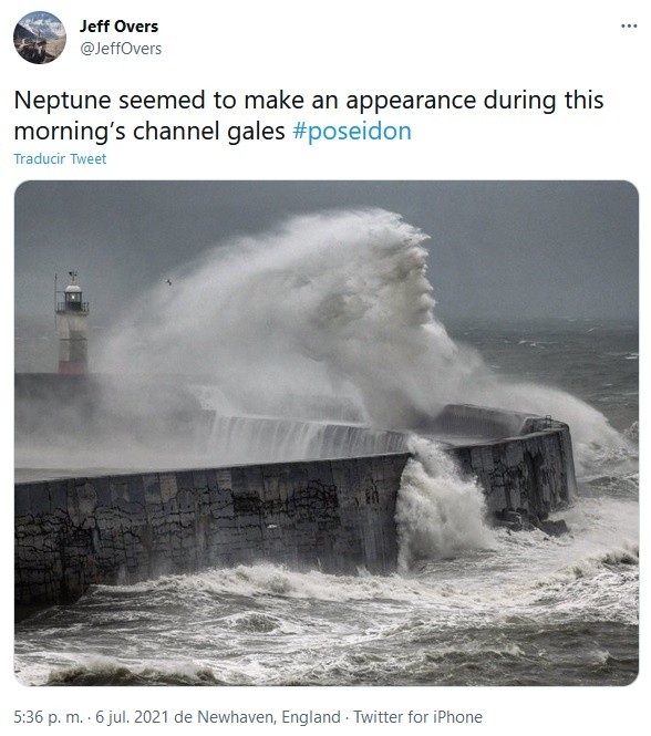 Una fotografía se ha hecho viral en las redes sociales. Se trata de la imagen de una ola que revienta en un muro y forma una silueta parecida a un rostro humano que ha sido señalado como el Neptuno, o Poseidón, el dios del mar según la mitología romana o griega, respectivamente.La estampa fue compartida en Twitter el pasado 6 de julio por el fotógrago de la agencia BBC, Jeff Overs, quien agregó un video que tituló: Marea alta en el puerto de Newhaven esta mañana, localidad situada al sur de Londres, en el Reino Unido.A partir de ese contenido, más tarde, Jeff Overs destacó un momento en el que la ola simula un rostro. Él mismo escribió: "Neptuno apareció durante los vendavales del canal de esta mañana #poseidon". La imagen del "rostro de Neptuno" rápidamente fue compartida por usuarios de redes sociales y ocasionado un cadena de reacciones. OA