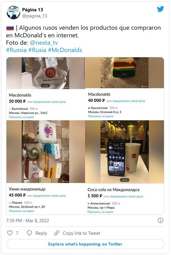 Después de que McDonald's, un símbolo cultural estadounidense, anunciara este martes el cierre temporal de sus 850 locales en Rusia alegando que no pueden "ignorar el innecesario sufrimiento causado a Ucrania", los consumidores rusos han abarrotado los restaurantes de la cadena de fast-food con la finalidad de abastecerse de sus productos antes de que cierren, y en algunos casos, revender las hamburguesas en línea a precios elevados.Actualmente, redes sociales como Reddit y Twitter se han llenado de posteos con fotos y videos en los que es posible ver las largas filas que están haciendo los rusos en las sucursales de la cadena de comida rápida.Al respecto, se volvió viral una foto compartida en el sitio web de discusión Reddit, en la que se mostraba un refrigerador de una persona rusa, repleto con al menos 50 hamburguesas de McDonald's, dejando apenas espacio para otros comestibles.Una leyenda junto a la imagen decía: "McDonald's está cerrando permanentemente en Rusia, aquí está la mercancía de mi amigo".De igual forma, varios sitios de subastas y plataformas de ventas online como Avito, portal ruso enfocado en subastas, ventas y anuncios clasificados, parecido a eBay, se ha llenado de una gran cantidad de publicaciones en las que varios usuarios intentan revender comida de McDonald's a precios exorbitantes, debido a que actualmente no están disponibles en ningún otro lugar del país.Entre los precios deslumbrantes de los productos de McDonald's, se puede encontrar publicaciones como la que incluye un doble big mac, una doble royal, dos porciones grandes de papas fritas, 18 McNuggets y salsas mozzarella, por la asombrosa cantidad de 255 libras (aproximadamente siete mil pesos), señalando además, que la comida estaba "todavía caliente".De acuerdo con el sitio informativo Daily Mail, otro ruso fijo en otro posteo el precio de una comida Big Mac en 250 libras (aproximadamente seis mil mil 900 pesos) mientras que uno más intentó vender tres bolsas de productos de McDonald's por la cantidad de 639 libras, es decir, aproximadamente 17 mil 455 pesos.McDonald's anunció el pasado martes que cerraría temporalmente sus tiendas en Rusia, las cuales generan alrededor del 9% de los ingresos anuales de dos mil millones de dólares de la compañía.Asimismo, a McDonald's se unieron otras compañías como Starbucks, Coca-Cola, PepsiCo y General Electric, que igualmente anunciaron que suspenderán temporalmente sus negocios en Rusia.JM