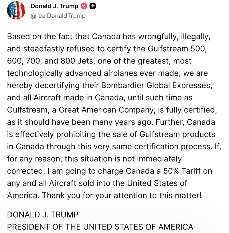 El presidente estadounidense Donald Trump amenazó este jueves a Canadá con imponer un arancel del 50% sobre cualquier avión vendido en Estados Unidos, en lo que representa la más reciente ofensiva dentro de su guerra comercial con el país vecino y de su disputa con el primer ministro canadiense Mark Carney.La advertencia de Trump, publicada en redes sociales, se suma a otra emitida el fin de semana, cuando el mandatario amenazó con un arancel del 100% a los bienes canadienses si Ottawa seguía adelante con un acuerdo comercial con China. No obstante, su mensaje no precisó cuándo o cómo se aplicarán los aranceles, ya que Canadá había alcanzado previamente dicho acuerdo. En su nueva amenaza, el presidente republicano aseguró que tomará represalias contra Canadá por negarse a certificar los aviones fabricados por Gulfstream Aerospace, con sede en Savannah, Georgia.Trump afirmó que, en respuesta, Estados Unidos descertificará todos los aviones canadienses, incluidos los de Bombardier, el mayor fabricante del país.“Si, por cualquier razón, esta situación no se corrige de inmediato, le voy a cobrar a Canadá un arancel del 50% sobre todos y cada uno de los aviones vendidos en Estados Unidos de América”, escribió Trump en su publicación.Asimismo, aseguró que “por la presente, descertifica” los jets ejecutivos Bombardier Global Express. Según datos de Cirium, empresa de análisis de aviación, actualmente hay 150 aviones Global Express registrados en Estados Unidos, operados por 115 compañías.Bombardier y Gulfstream compiten directamente en el mercado de jets de negocios, donde la serie Global rivaliza con los modelos más recientes de Gulfstream.Por el momento, Bombardier y el Ministerio de Transporte de Canadá no han respondido a las solicitudes de comentarios enviadas el jueves por la noche.El experto en aviación John Gradek, profesor de la Universidad McGill, advirtió que la certificación “es un proceso relacionado con la seguridad” y que revocarla por motivos comerciales sería algo sin precedentes.“La certificación no es algo trivial; es un paso esencial para garantizar la operación segura de los aviones”, explicó Gradek. “Nadie está criticando a Gulfstream, pero una descertificación con fines políticos o comerciales no tiene precedentes”.Gradek añadió que, durante años, muchos modelos de Gulfstream han sido certificados en Canadá, y calificó la decisión de Trump como “una cortina de humo” y una nueva provocación contra el primer ministro Carney en el marco de la guerra comercial.En 2017, durante su primer mandato, el Departamento de Comercio estadounidense impuso aranceles a los aviones comerciales de Bombardier, alegando que la empresa los vendía por debajo de su costo gracias a subsidios del gobierno canadiense. Sin embargo, la Comisión de Comercio Internacional de Estados Unidos determinó posteriormente que Bombardier no perjudicaba a la industria estadounidense.Desde entonces, la compañía con sede en Montreal se ha concentrado en el mercado de jets ejecutivos, con sus familias Global y Challenger, populares entre empresarios, propietarios privados y firmas de vuelos compartidos como NetJets y Flexjet. Una eventual restricción al mercado estadounidense representaría un duro golpe para la empresa de Quebec. Por otra parte, el secretario del Tesoro de Estados Unidos, Scott Bessent, advirtió a Carney que sus críticas recientes a la política comercial estadounidense podrían volverse en su contra durante la revisión del Acuerdo Estados Unidos–México–Canadá (T-MEC), tratado que protege a Canadá de los impactos más severos de los aranceles estadounidenses.Carney negó haber rectificado sus declaraciones ante Trump y aseguró que mantuvo su postura durante la conversación telefónica que ambos sostuvieron el lunes, reiterando que Canadá busca diversificar sus alianzas económicas con una docena de nuevos acuerdos comerciales.Durante su discurso en el Foro Económico Mundial de Davos, Carney condenó la “coerción económica” ejercida por grandes potencias sobre naciones más pequeñas, sin mencionar directamente a Trump. Su intervención recibió amplios elogios internacionales, opacando la participación del mandatario estadounidense. Además de Bombardier, Canadá alberga a otros fabricantes relevantes como De Havilland Aircraft of Canada, especializada en aviones turbohélice y aeronaves de patrullaje, y Airbus, que produce en el país el modelo A220 y diversos helicópteros.Cabe recordar que, bajo la administración del expresidente Joe Biden, la Administración de Comercio Internacional destacó la interdependencia entre las industrias aeroespaciales de Estados Unidos y Canadá, y citó el Acuerdo de 1980 de la Organización Mundial del Comercio, el cual obliga a los países firmantes a eliminar los aranceles sobre aviones civiles, motores, simuladores y componentes relacionados. EE
