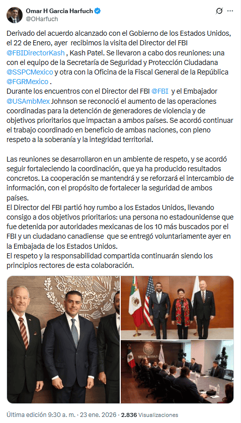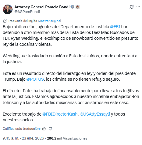 El ex atleta olímpico canadiense Ryan Wedding, uno de los narcotraficantes más buscados de Estados Unidos y que ha sido comparado con Joaquín "Chapo" Guzmán, fue detenido reporta este viernes 23 de enero la cadena de televisión estadounidense NBC News.El medio no señaló dónde se había producido la detención de Wedding, pero las autoridades estadounidenses creían que estaba escondido en México, protegido por el Cártel de Sinaloa.Momentos después, el secretario de Seguridad Pública y Protección Ciudadana de México, Omar García Harfuch, informó en sus redes sociales que ayer se tuvo en el país la visita del Director del FBI, Kash Patel, quien hoy viajó a Estados Unidos llevando consigo a dos de los objetivos prioritarios, entre ellos, "una persona no estadounidense que fue detenida por autoridades mexicanas de los 10 más buscados por el FBI y un ciudadano canadiense que se entregó voluntariamente ayer en la Embajada de los Estados Unidos", sin precisar que se tratara del ex atleta.En sus redes sociales, la fiscal general de EU, Pam Bondi, dijo que Wedding fue trasladado en avión a Estados Unidos, donde enfrentará a la justicia.Bondi también resaltó que la detención es "un resultado directo del liderazgo en ley y orden del presidente Trump. Bajo @POTUS, los criminales no tienen refugio seguro".Para cerrar, señaló que "el director Patel ha trabajado incansablemente para llevar a los fugitivos ante la justicia. Estamos agradecidos a nuestro increíble embajador Ron Johnson y a las autoridades mexicanas por asistirnos en este caso".Ryan Wedding, de 44 años, representó a Canadá en los Juegos Olímpicos de Invierno de 2002 en Salt Lake City (Utah, Estados Unidos) en la modalidad de snowboard.Sin embargo, años después era buscado por el FBI por cargos de dirigir una organización transnacional de tráfico de drogas responsable de importar alrededor de 60 toneladas de cocaína al año a Los Ángeles a través de camiones semirremolque desde México, dijo anteriormente la fiscal feneral, Pam Bondi en una conferencia de prensa hace algunos meses.Por su parte, el director del FBI, Kash Patel, había comparado a Wedding con el fallecido narcotraficante colombiano Pablo Escobar y el mexicano Joaquín "Chapo" Guzmán, líder del Cártel de Sinaloa en nuestro país.En marzo de 2025, Wedding fue agregado a la lista de los "Diez más buscados" del FBI, y había una recompensa de 15 millones de dólares por información que condujera a su arresto y/o procesamiento. Las autoridades mexicanas incautaron en 2025 docenas de motocicletas con un valor estimado de 40 millones de dólares, que se creía eran propiedad de Wedding. También incautaron dos medallas olímpicas, dos vehículos, drogas, obras de arte y otros artículos en varios lugares de la Ciudad de México.De acuerdo con El Universal, se espera que más tarde haya una conferencia de prensa sobre el caso.*Con información de EFE y SUN*Mantente al día con las noticias, únete a nuestro canal de WhatsApp OF