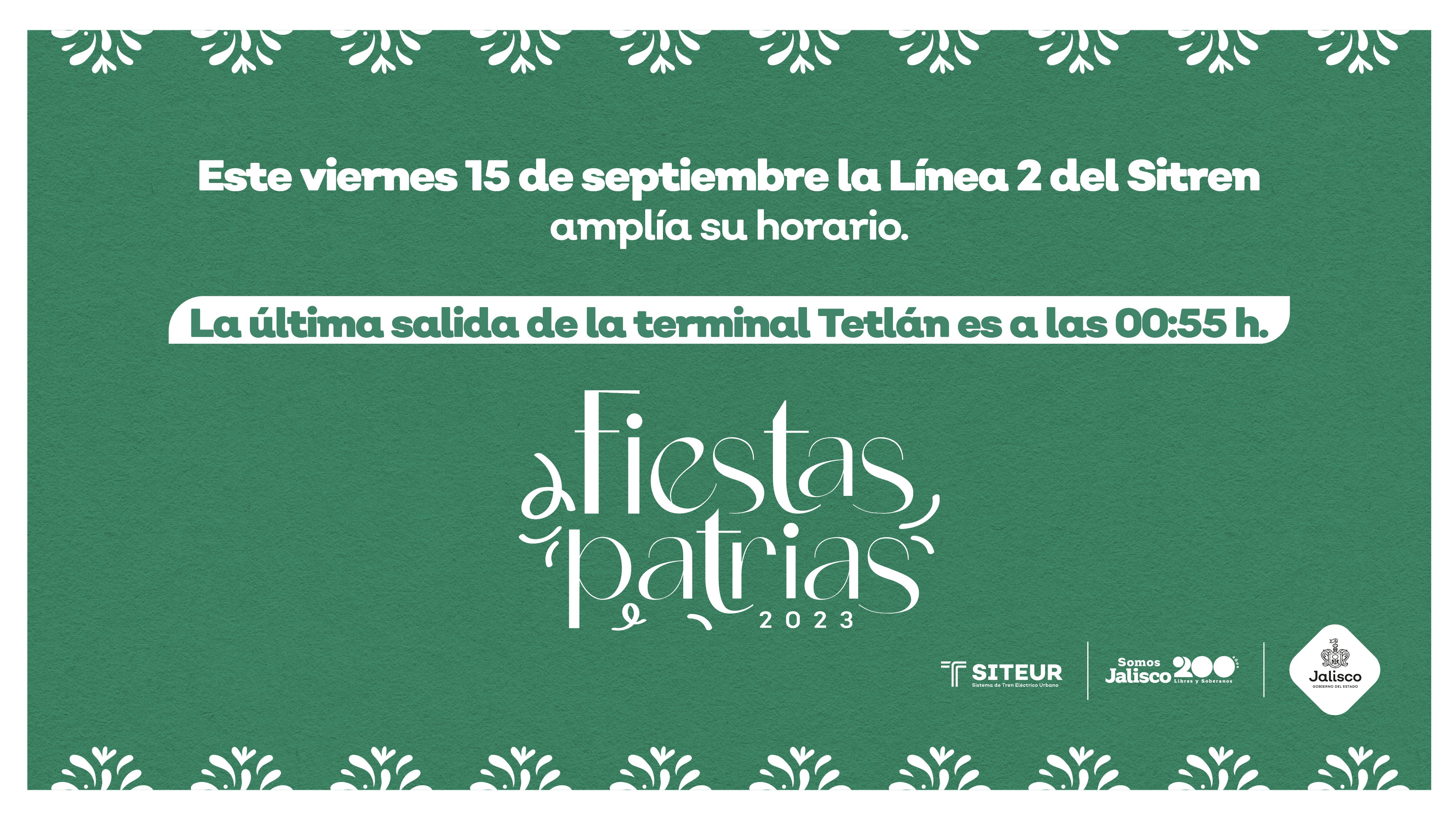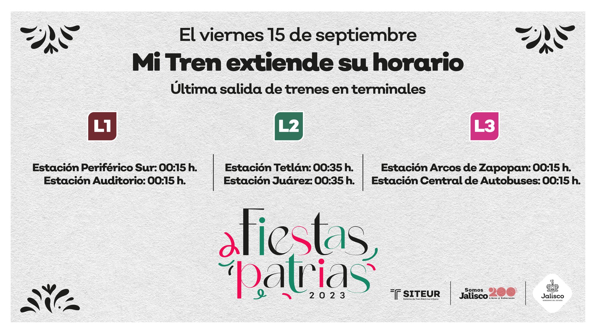 ¿Estás listo para dar el Grito de la Independencia? En Guadalajara, este 15 de septiembre en la Plaza Liberación se vivirá uno de los conciertos gratuitos más esperados del año, pues estará Café Tacvba cerrando el festejo del Día de la Independencia, justo después de que el Gobernador de Guadalajara dé el Grito de Dolores.Para que todas y todos disfruten de las fiestas patrias en Guadalajara se extenderá el servicio del transporte público, así lo informó SITEUR Jalisco a través de sus canales oficiales. Toma en cuenta que, como cada año, habrá camiones que modifiquen su ruta, si quieres saber cuáles son te invitamos a leer:Respecto al tren ligero, SITEUR dio a conocer que ampliarán horarios de los servicios de las líneas 1, 2 y 3 del Tren Ligero, así como del Macrobús. Ahora que ya conoces los horarios extendidos del transporte público de Guadalajara, disfruta de las fiestas patrias.