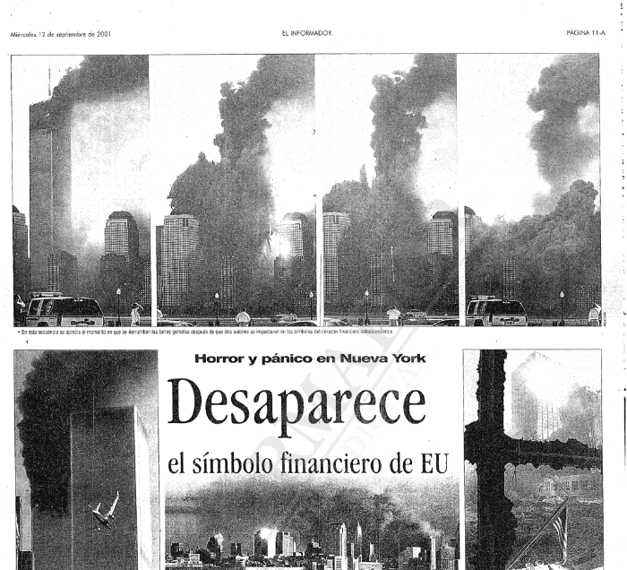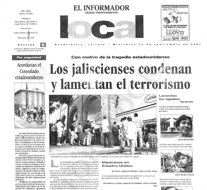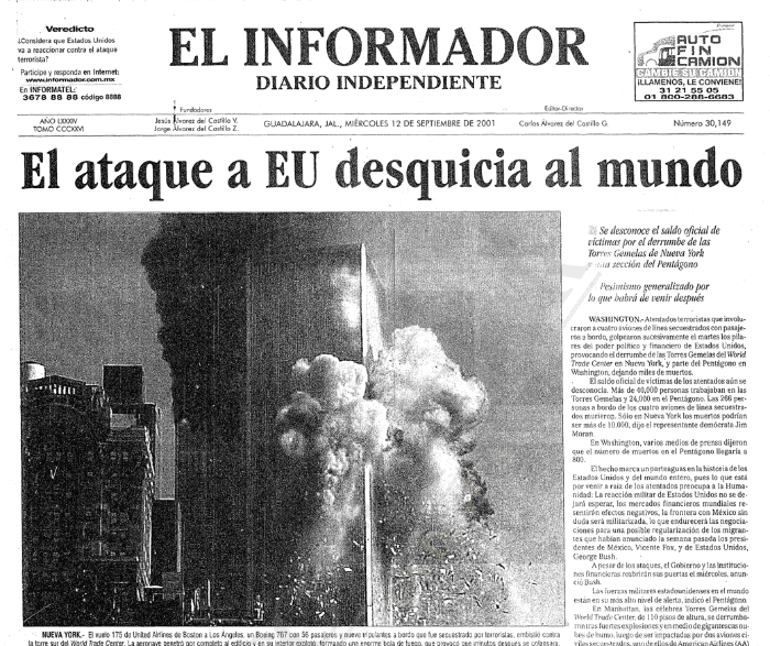 Hoy se cumplen 23 años del atentado a las Torres Gemelas de Nueva York, uno de los acontecimientos determinantes del nuevo siglo, y que le dio un giro inesperado e irremediable a la historia contemporánea. El mundo entero siguió la cobertura de cómo se derrumbaban las Torres Gemelas, dos de los edificios más emblemáticos de Estados Unidos y de la Gran Manzana en general. Dos aviones aparecieron en el azul infinito del cielo, donde no había nubes, y se precipitaron como flechas dentro de los edificios, que con el transcurso de las horas se cubrieron de humo, metal ardiente, escombros perdidos en el viento, como aves desordenadas.Así fue como EL INFORMADOR publicó la tragedia un día después, cuando el mundo se enrareció hace dos décadas, en aquella mañana que cambió la historia. "Se desconoce el saldo oficial de víctimas por el derrumbe de las Torres Gemelas de Nueva York y una sección del Pentágono""Pesimismo generalizado por lo que habrá de venir después" Los devastadores ataques en diferentes puntos de Estados Unidos de Norteamérica provocaron la angustia de decenas de familias jaliscienses que cuentan con familiares que trabajan y viven en aquel país; al igual que pueblos enteros al rededor del mundo enmudecidos ante las imágenes de tal tragedia, los jaliscienses expresaron su condena a los actos terroristas. En una encuesta periodística realizada por EL INFORMADOR, los habitantes de esta ciudad coincidieron que la pena que hoy abraza a la historia marcará un futuro incierto en todas las naciones, lamentando principalmente la muerte de centenares en el vecino país del Norte.Sin embargo, a pesar de los hechos trágicos, los tapatíos manifiestan su preocupación por las consecuencias directas que provocará a la economía nacional y local. "No se vale que diferentes grupos sean de donde sean estén masacrando a la sociedad mundial, evidentemente esto debe recibir la condena de todo el mundo", expresó el entonces gobernador de Jalisco, Alberto Cárdenas Jiménez.La embestida terrorista que sucedió ayer martes por la mañana a la capital estadounidense, causó una gran preocupación en el mundo entero y Guadalajara no fue la excepción, en donde se hizo necesario que se tomaran medidas de extrema seguridad particularmente en el Consulado General de Estados Unidos en Guadalajara. FS